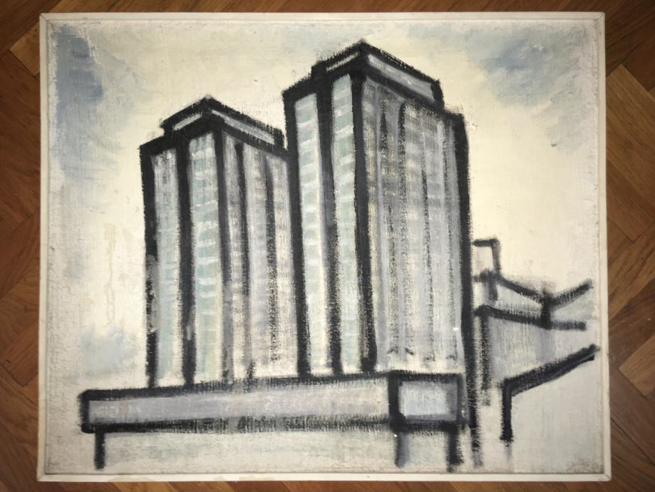 Ulje na platnu poznatog hrvatskog, prvenstveno znanstvenika i profesora, ali i pjesnika i slikara, Osmana Muftića (Sarajevo, 8. III. 1934 – Zagreb, 27. VII. 2010). Motiv su neboderi u Čazmanskoj ulici u Zagrebu. Dimenzije slike s okvirom su 74x61cm. Vrlo rijetko na tržištu.