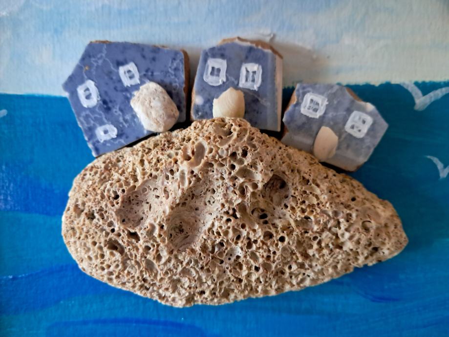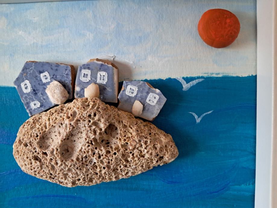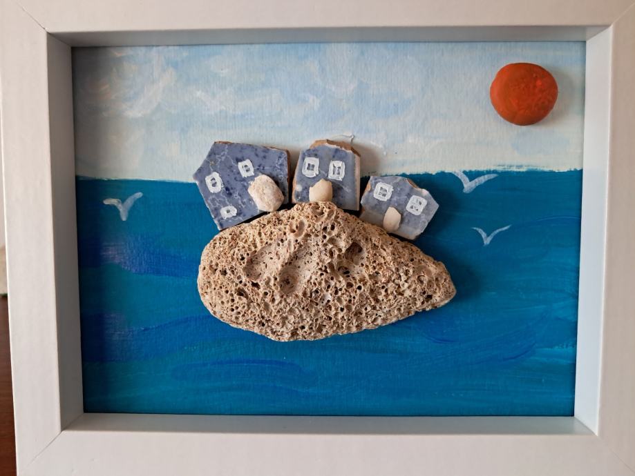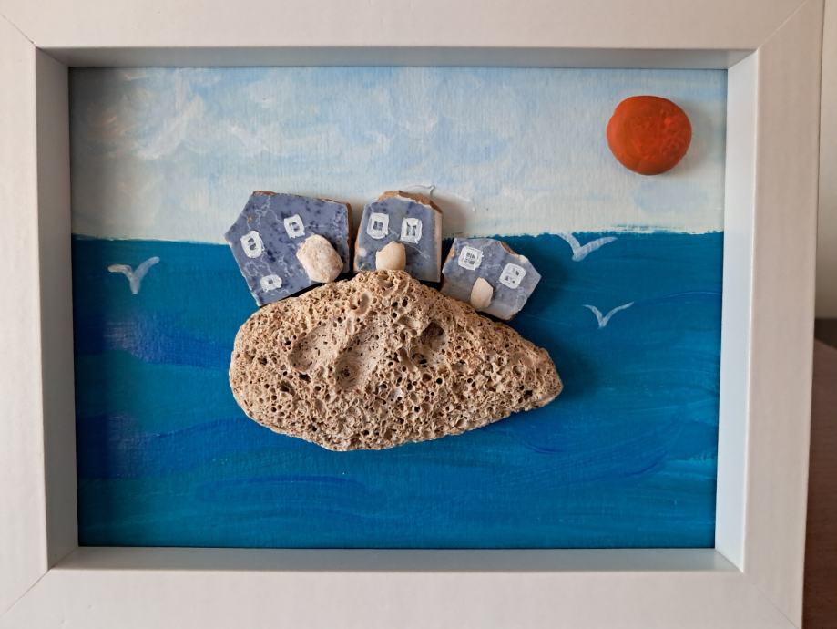 Ova lijepa slika izrađena je od morskog kamena i školjkica, te obojana akrilnim bojama.Veseli ugođaj odvodi nas negdje na otok u moru.Dimenzije su 23 × 18 cm.