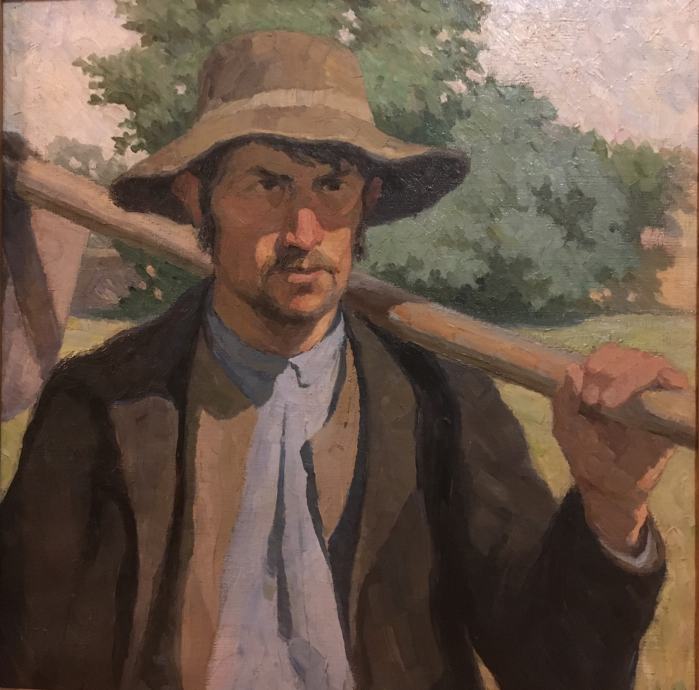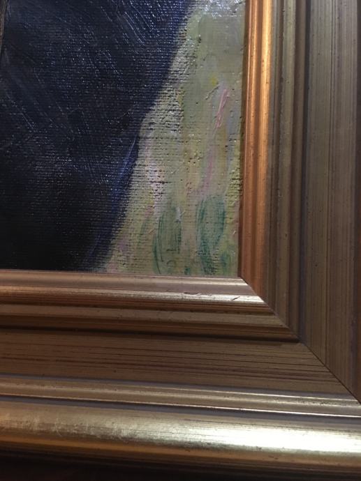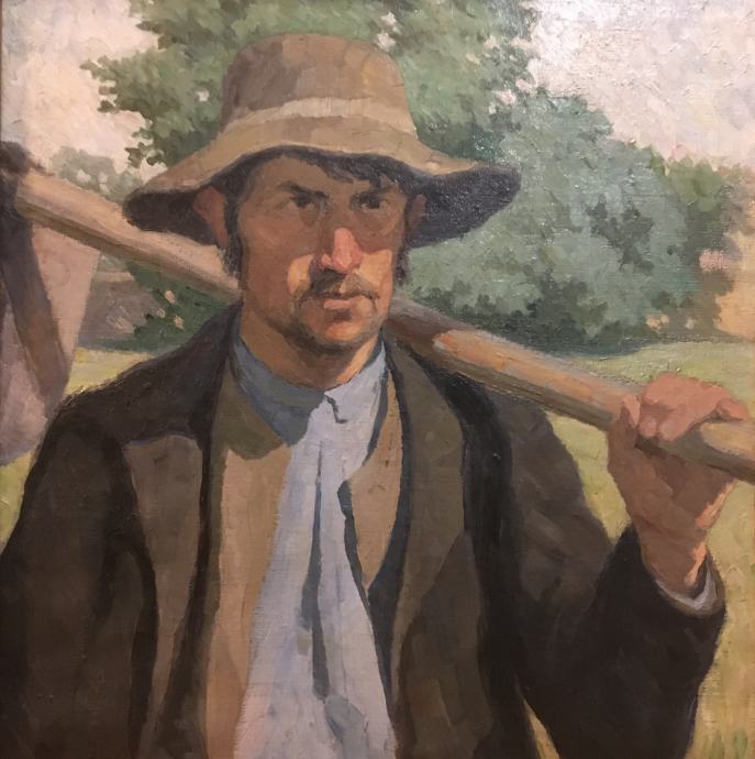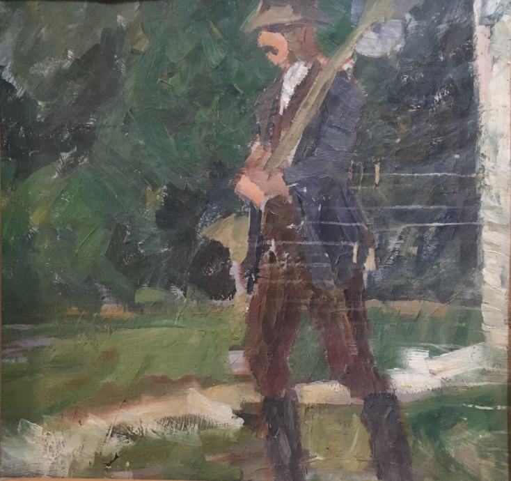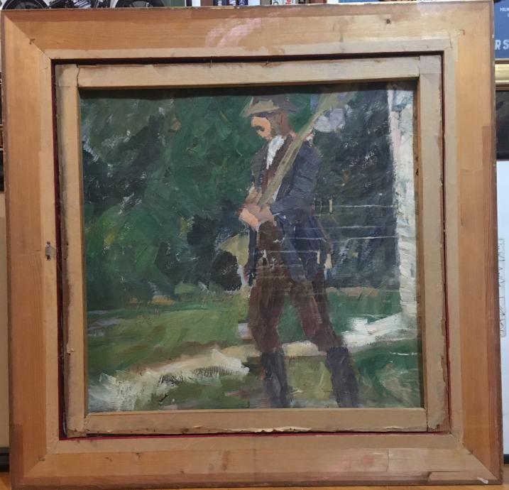 Staro ulje na platnu sa seoskim motivom (seljak). Na stražnjoj strani platna skica druge slike. Potpisano sa "O.P." u donjem desnom kutu. Nema drugih oznaka. Moguće da je autor čuveni hrvatski slikar Oton Postružnik, ali nisam siguran pa je potrebno dodatno istražiti. Priložene su neke fotografije radova Otona Postružnika (iz monografije) sa sličnim motivima. Luksuzno uramljeno u masivni drveni okvir. Dimenzije s okvirom su 80x80cm. Dimenzije same slike su 65x63cm.