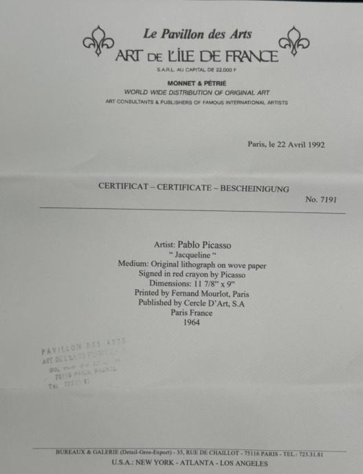 23x30 cm dimenzija slike, 45x55 cm sa okvirom. Originalno potpisana od Picassa.