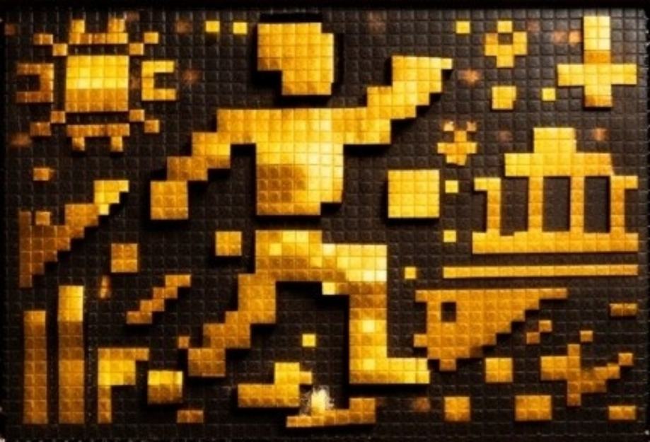 Paledy’s Art – Pixel Manifest predstavlja sintezu arhivske svijesti i suvremenog digitalnog izraza, oblikovanu kroz preciznu, zlatnu pikselnu kompoziciju na tamnoj podlozi. Središnja figura u pokretu, reducirana na elementarne digitalne module, simbolizira prijelaz iz analognog u digitalno doba – transformaciju memorije u kod, povijesti u strukturu, baštine u suvremeni vizualni jezik.