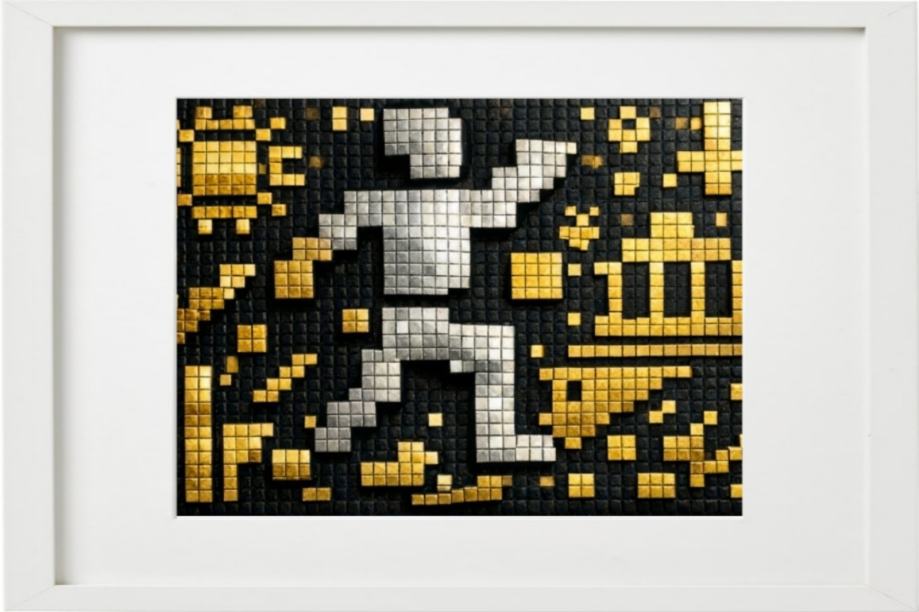 Paledy’s Art – Pixel Manifest predstavlja sintezu arhivske svijesti i suvremenog digitalnog izraza, oblikovanu kroz preciznu, zlatno srebrnu pikselnu kompoziciju na tamnoj podlozi. Središnja figura u pokretu, reducirana na elementarne digitalne module, simbolizira prijelaz iz analognog u digitalno doba – transformaciju memorije u kod, povijesti u strukturu, baštine u suvremeni vizualni jezik.