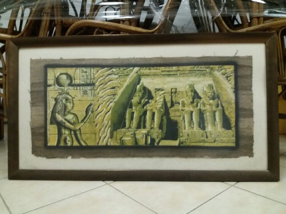 Original egipatski papirus velikog formata uramljen u kvalitetni masivni metalni okvir. Dimenzije uramljene slike 110 cm x 60 cm. Dimenzije slike na papirusu 90 cm x 40 cm bez rame. Papirus je besprijekorno očuvan, dio bijele podloge uz ramu ima nekoliko sitnih oštećenja, ali nemaju veze sa papirusom.