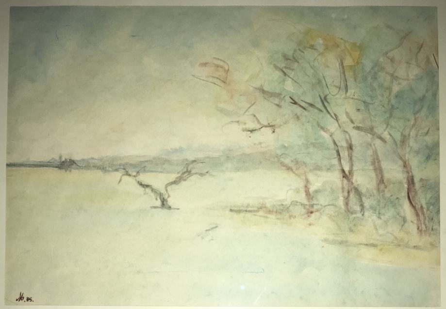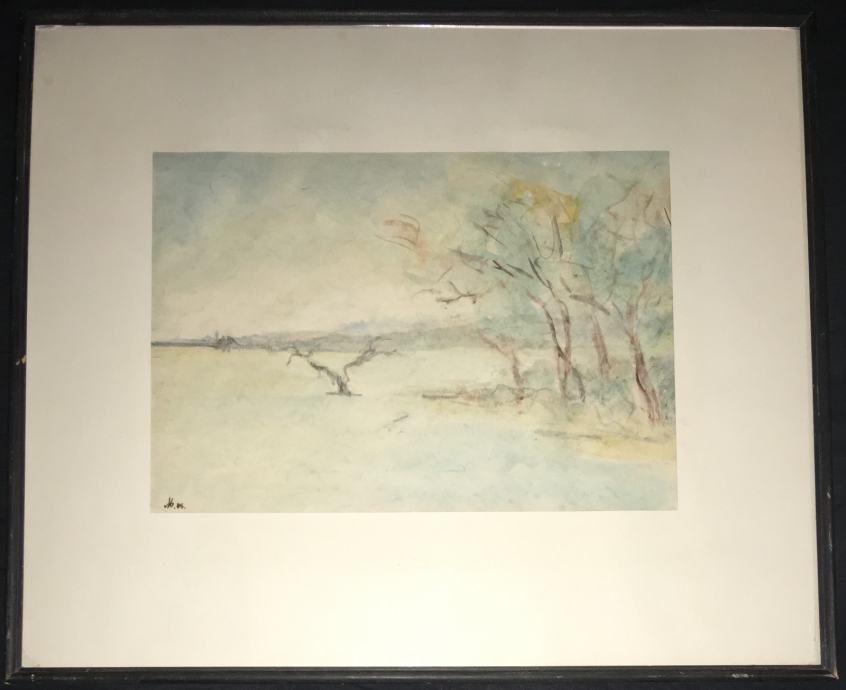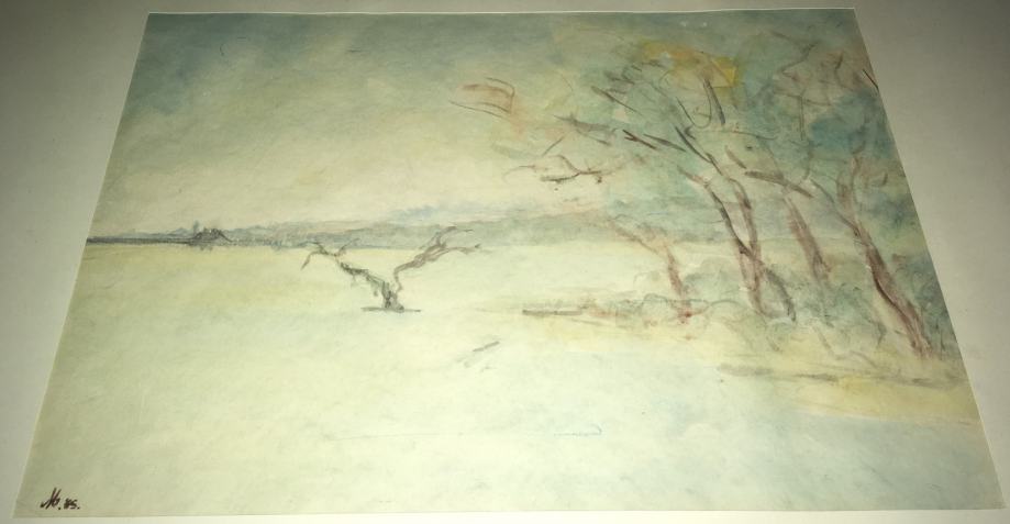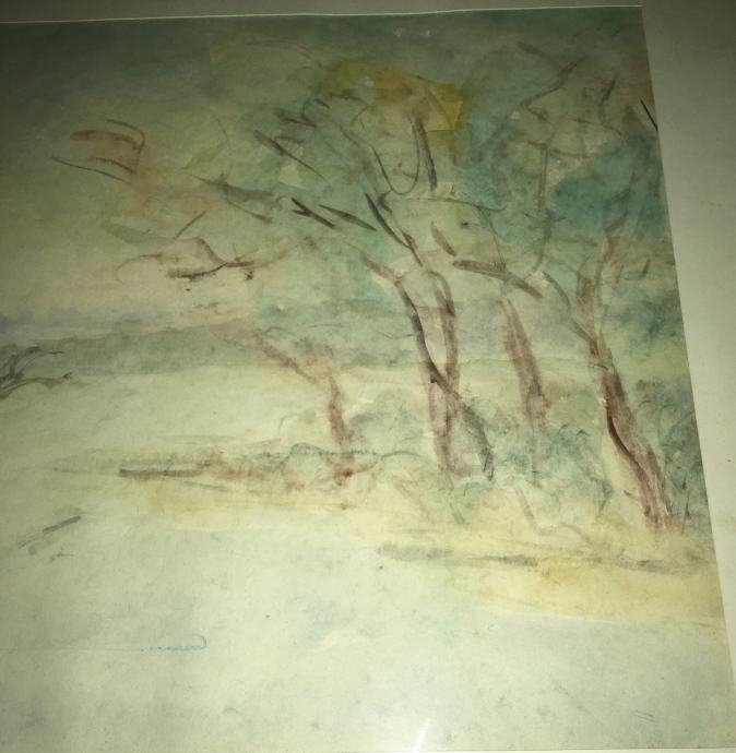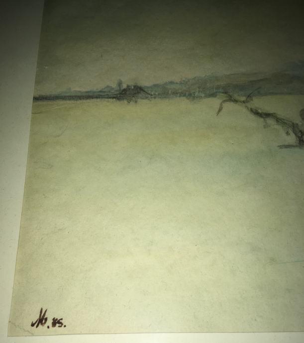 Akvarel iz 1985.g. s motivom pejzaža, nepoznati autor (potpis "M. 85"). Uokvireno i ostakljeno. DImenzije s okvirom 61x52cm (unutar paspartua 40x28cm).