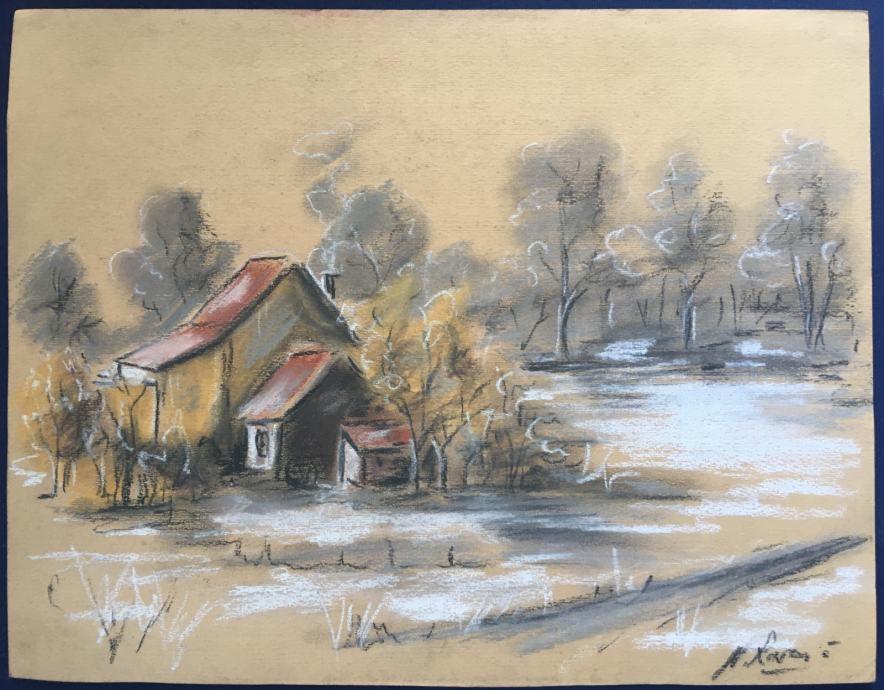 Pastel na papiru, motiv pejzaž, meni nepoznatog autora (mislim da je potpis N. Rašović ili nešto slično). Dimenzije su cca 35x25cm,