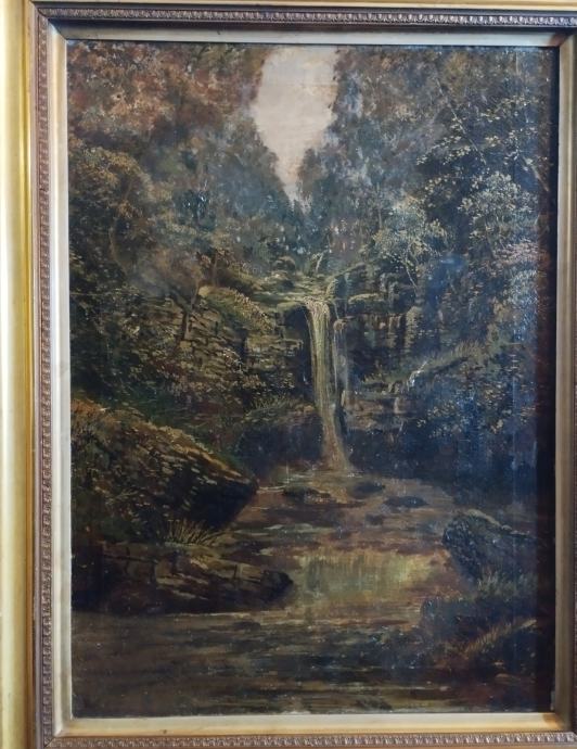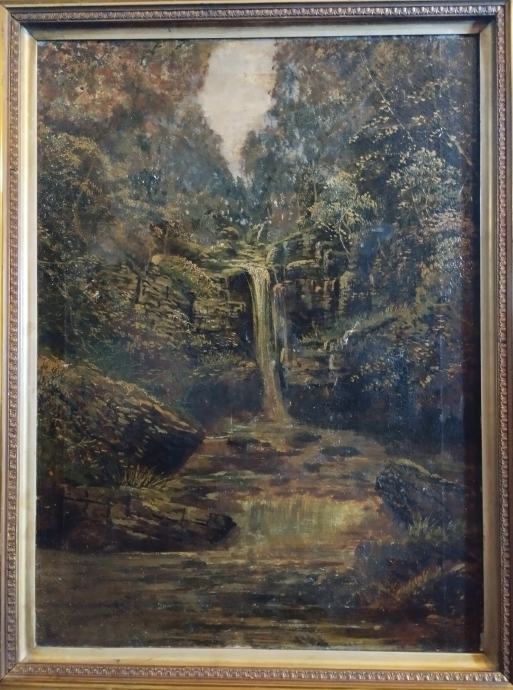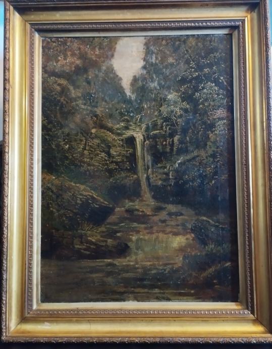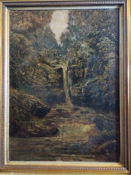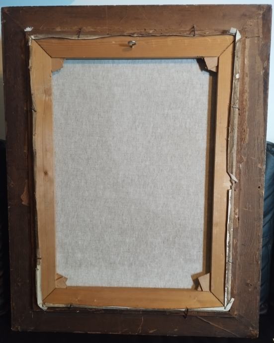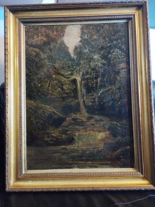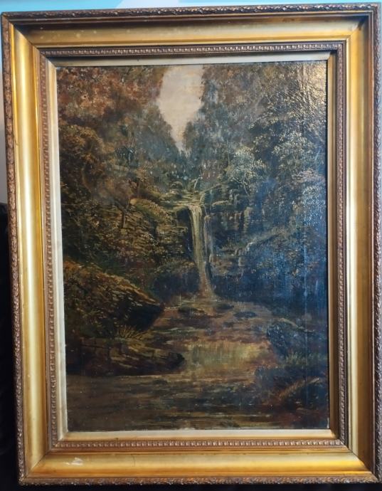 Staro ulje na platnu s motivom šumskog pejzaža. Vrlo staro platno je profesionalno kaširano na novo. Stari masivni okvir, izvrsna slika. Ukupne dimenzije s okvirom su 75x60cm.