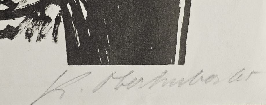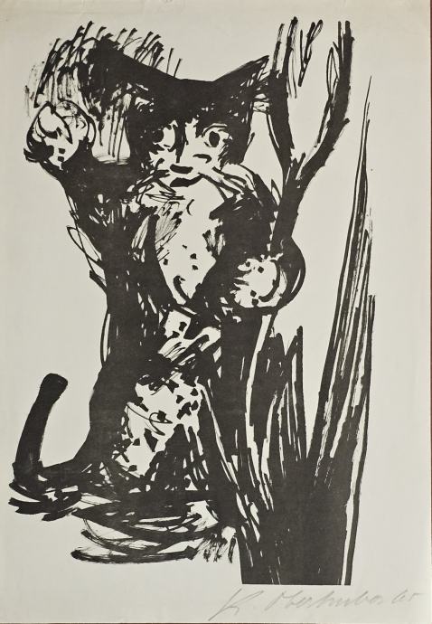 Originalna grafika snažnog ekspresionističkog karaktera, potpisana i datirana 1965. godine u donjoj margini.