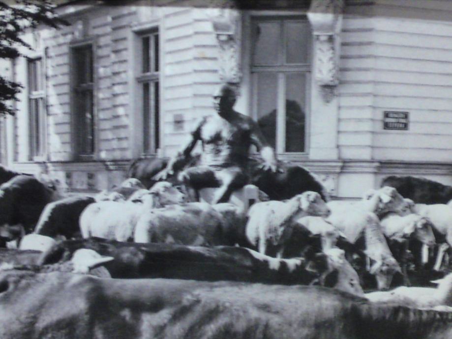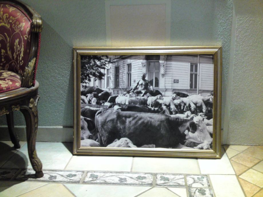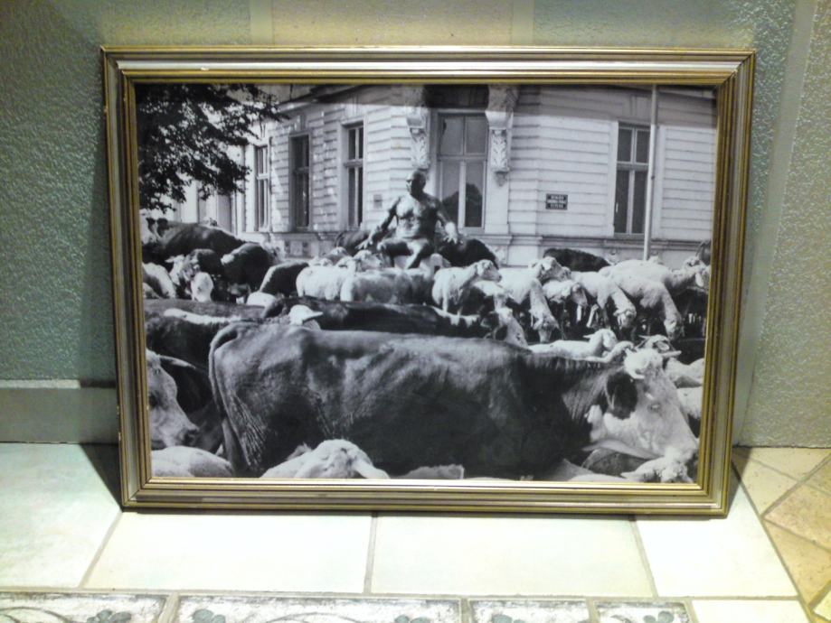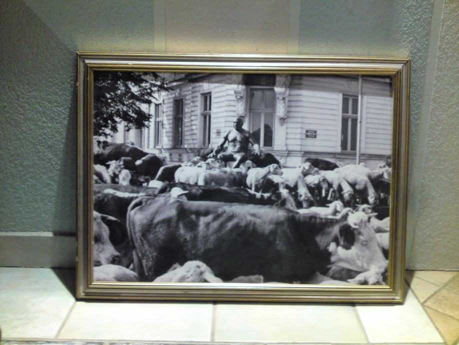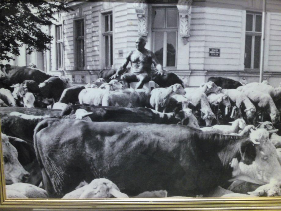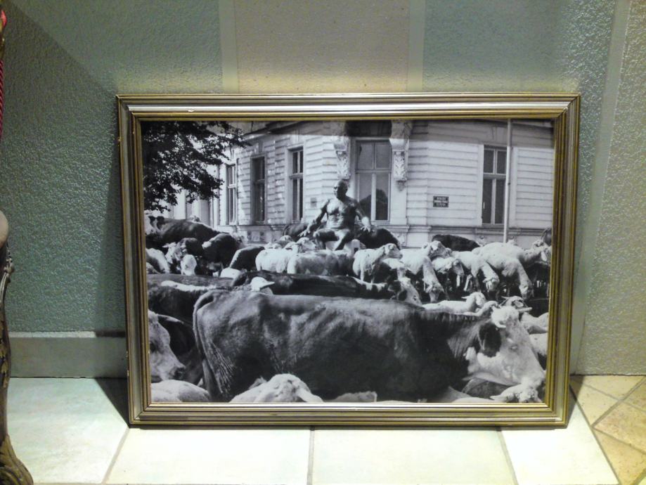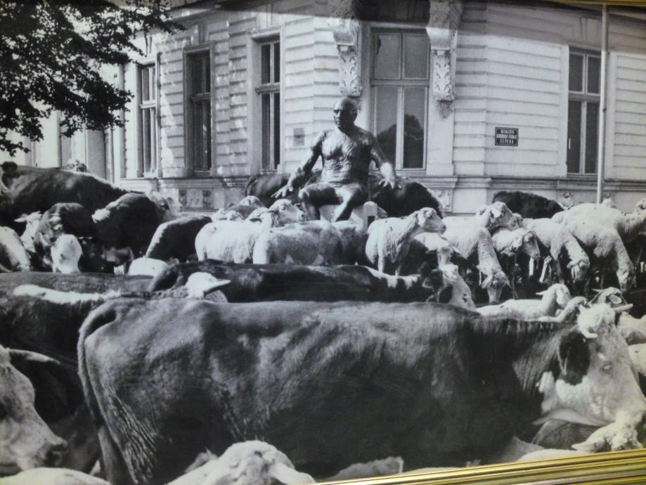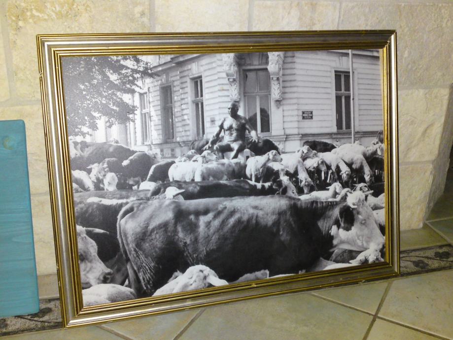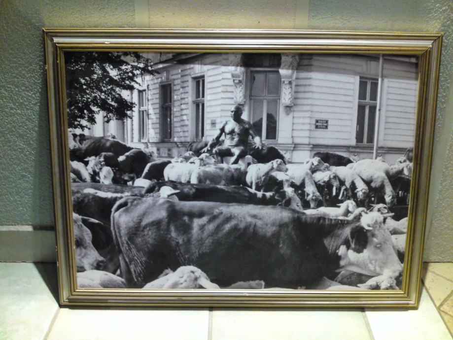 Umjetnička crno-bijela fotografija koja spaja nespojivo: kip Picasa na promenadi u središtu Osijeka i krdo krava i ovaca, u okviru sa pozlatom. Autor fotografije : Tomislav Balaš, preminuli fotograf Glasa Slavonije.