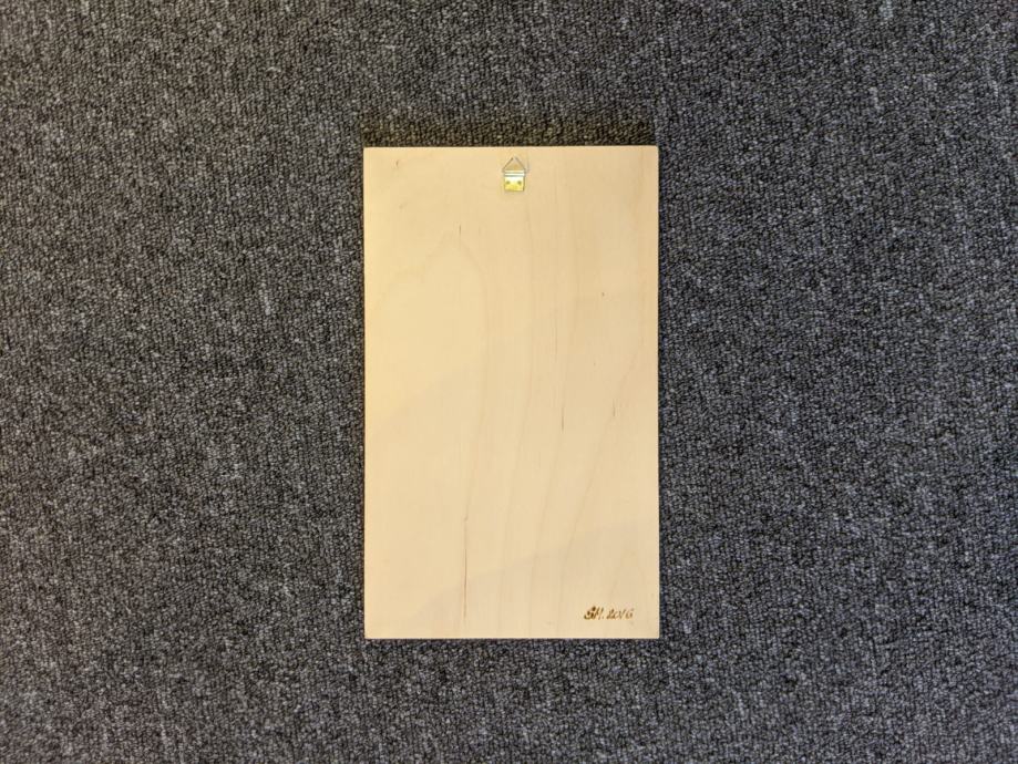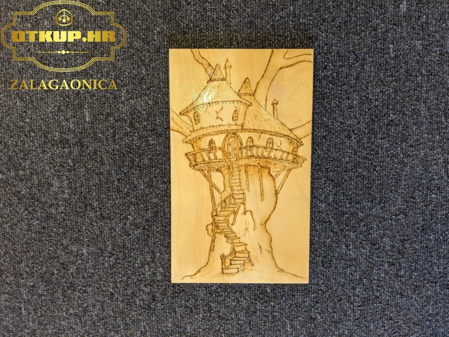 Prodaje se pirografija na drvetu sa motivom kuće na drvetu.