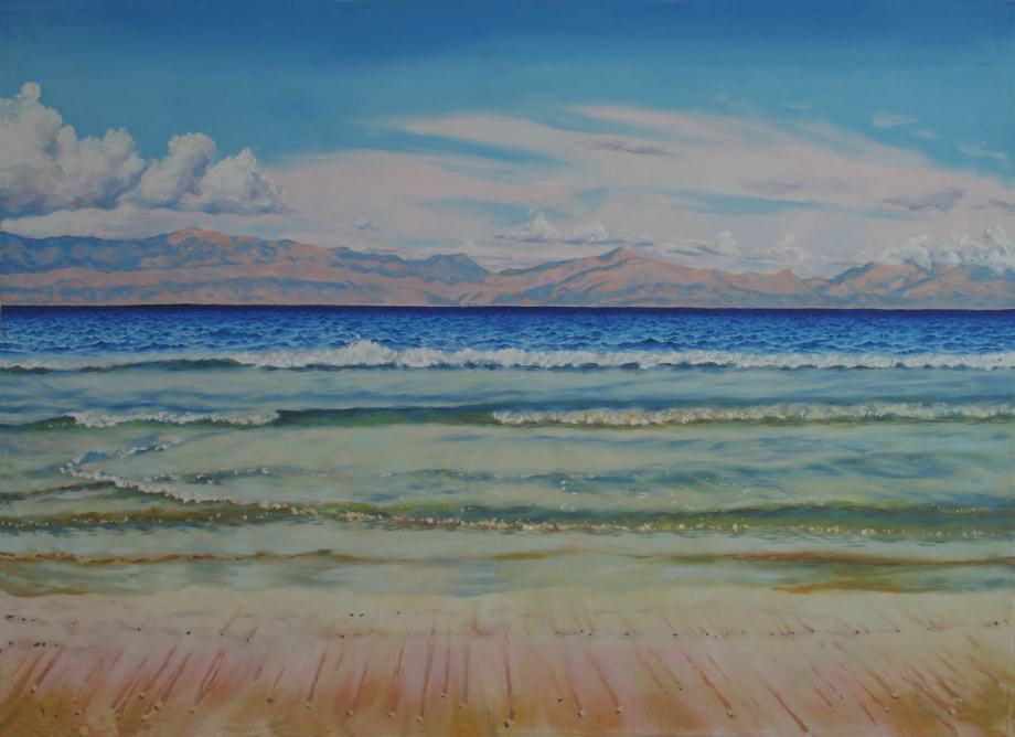 Na slici s vidi pogled iz jedne male pješćane plaže između Supetra i Splitske sa pogledom prema Mosoru i Biokovu. U sredini slike naazi se Momiš koji je smješten u određenoj konfiguraciji planine i ušća rijeke.