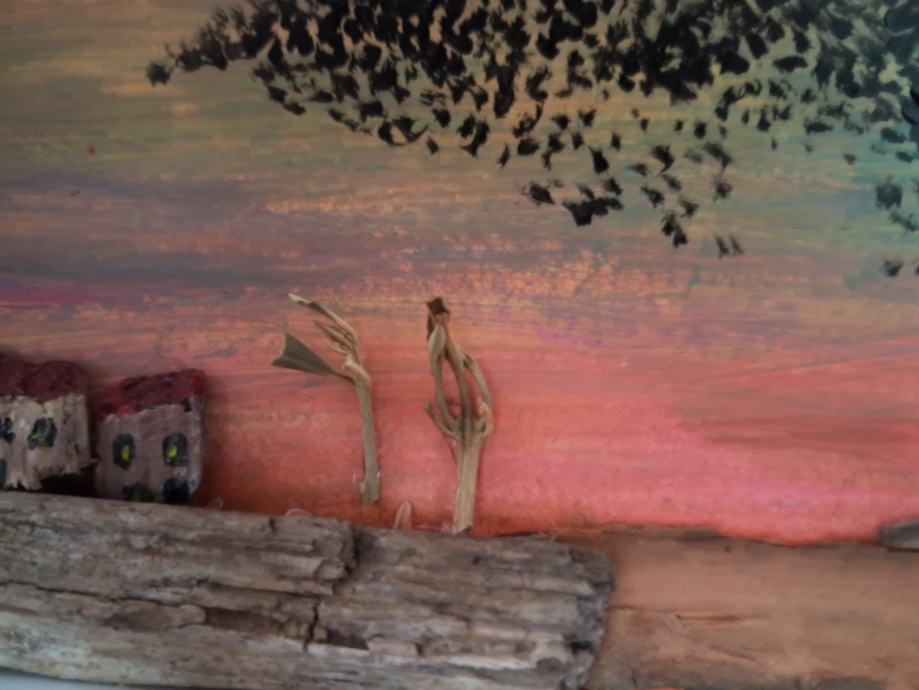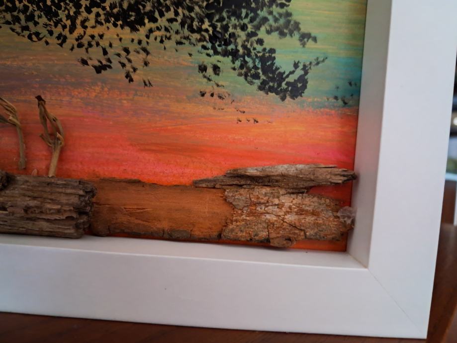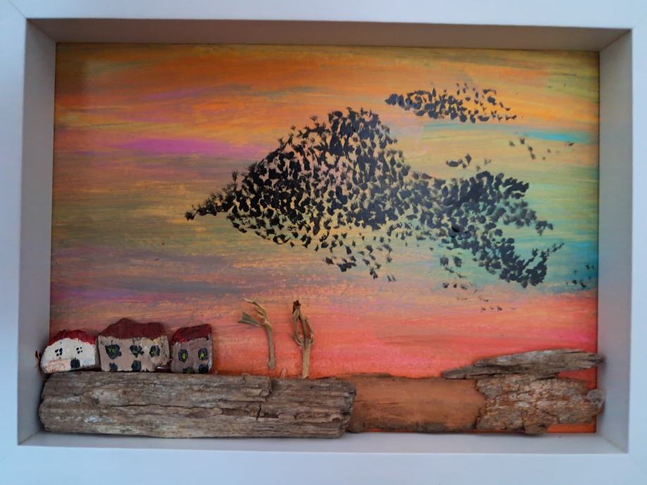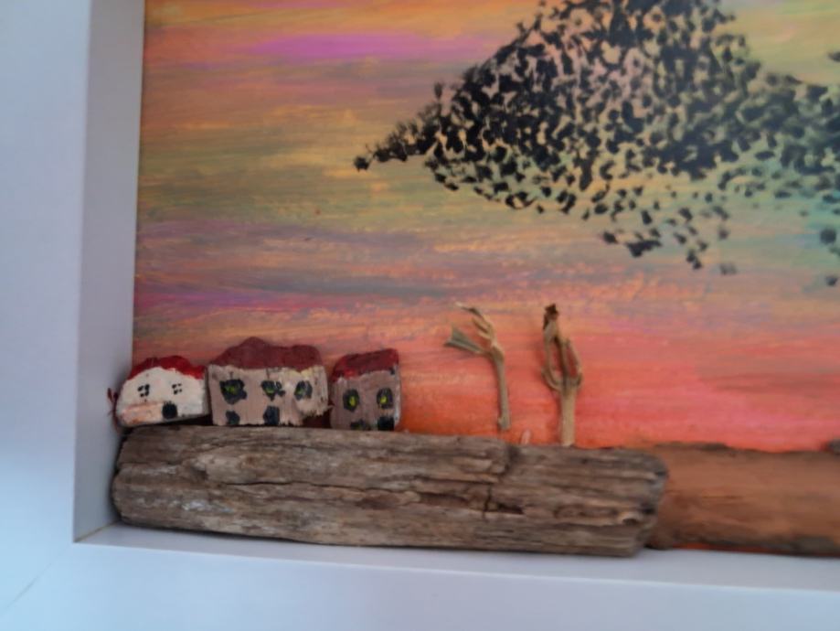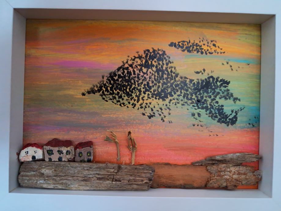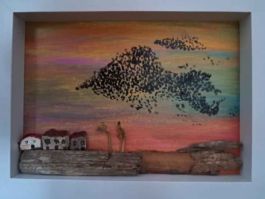 Ova lijepa sličica izrađena je od komada naplavina i obojana akrilnim bojama.Često u suton vidimo jato ptica koje kao da plešu, pa je tako i nastala ova slika.Dimenzija je 20 × 15,5 cm.