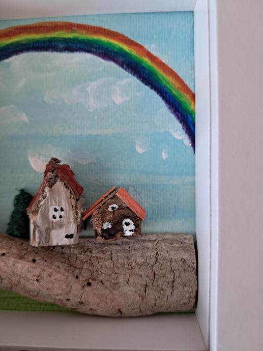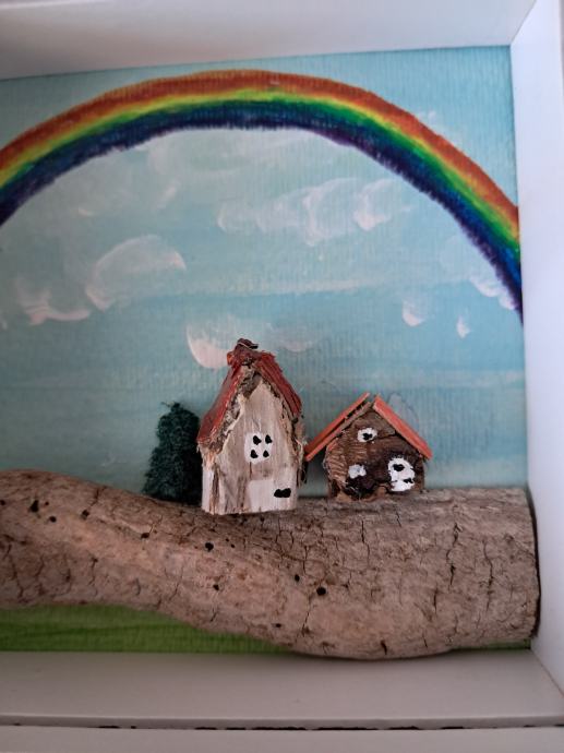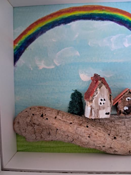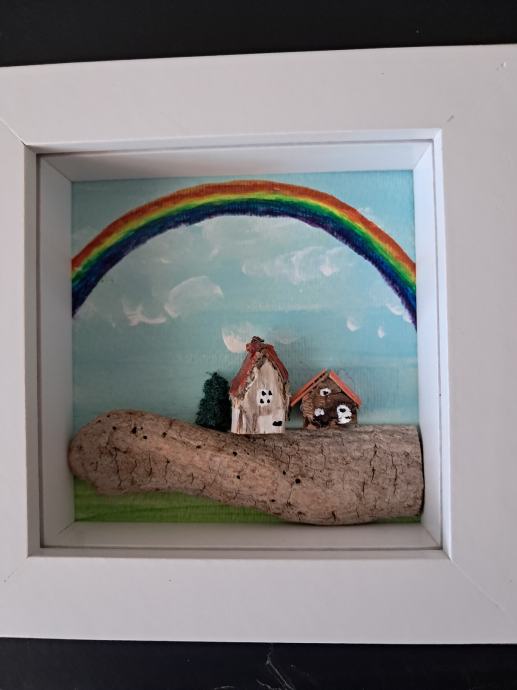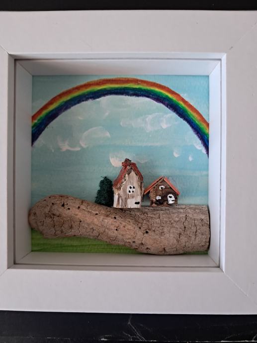 Ova slatka sličica izrađena je od morskih naplavina i obojana akrilnim bojama.Prizor kućica pod dugom uveseljava svaki kutak doma ili poklon dragoj osobi.Dimenzije su 12 × 12 cm.
