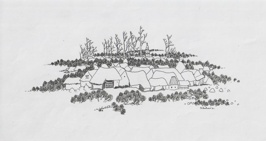 Motiv: selo s tradicijskim kućama i crkvom u pozadini