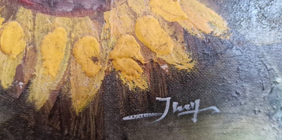 Polja suncokreta, potpisano, ne mogu odgonetnuti potpis, debeli nanosi ulja na platnu. Lijepa slika dimenzije cca 60x50 cm.