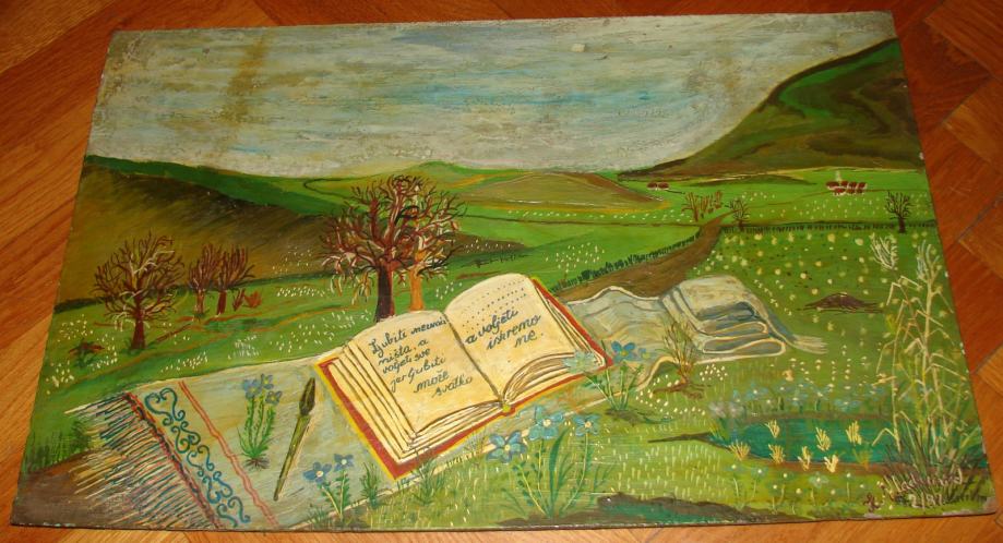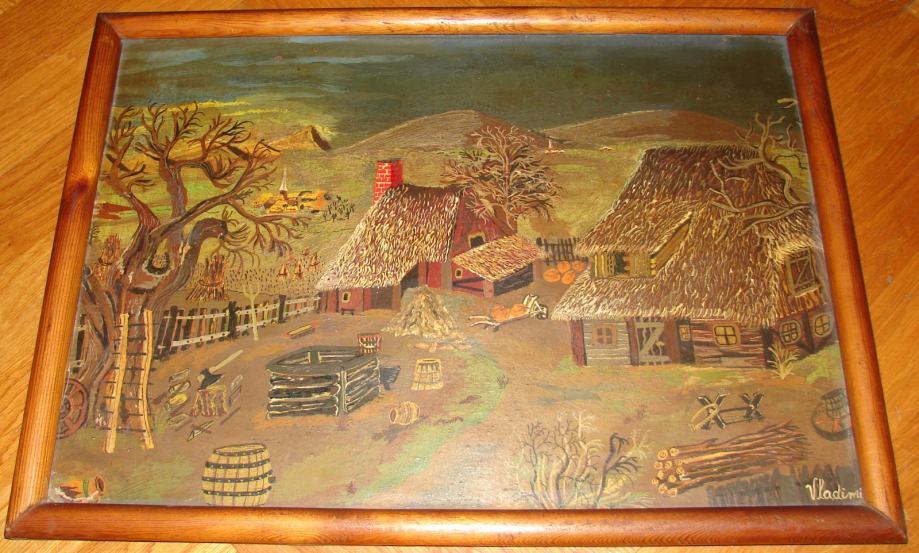 2 ulja na lesonitu s kraja 80-tih, naiva. Autor Vladimir K. Dimenzije cca 5x32cm. Stari drveni okvir na prvoj slici, druga neuokvirena. 900 kn za obje slike.