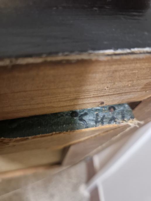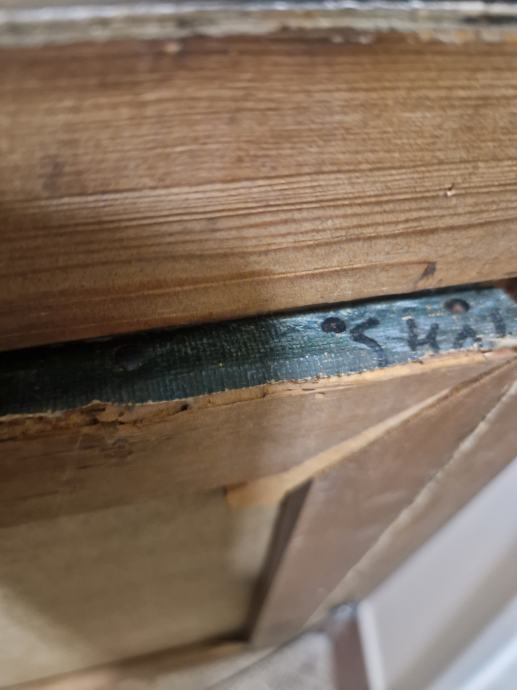 Platno oko 45 x 36 cm a s oko 55 x 46 cm...potpis je na dnu platna pa kad se stavljalo platno na ramu, ostao je iza :)