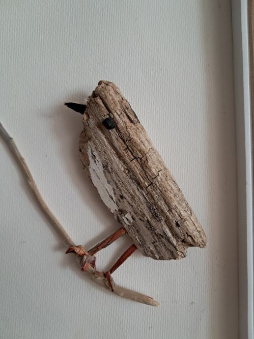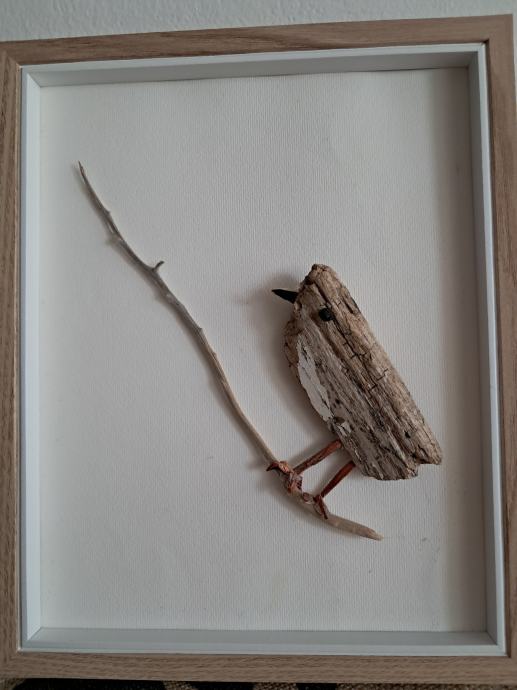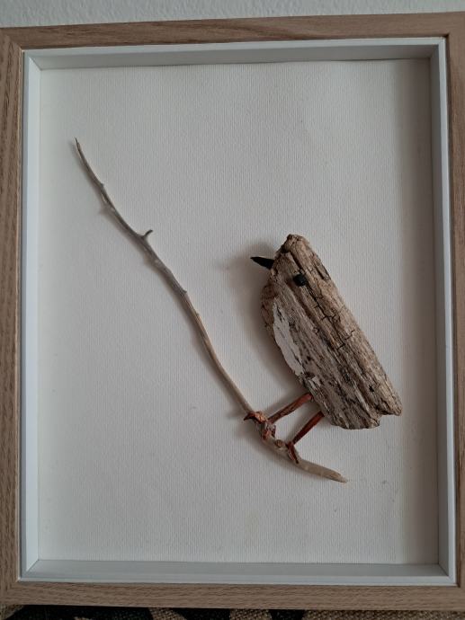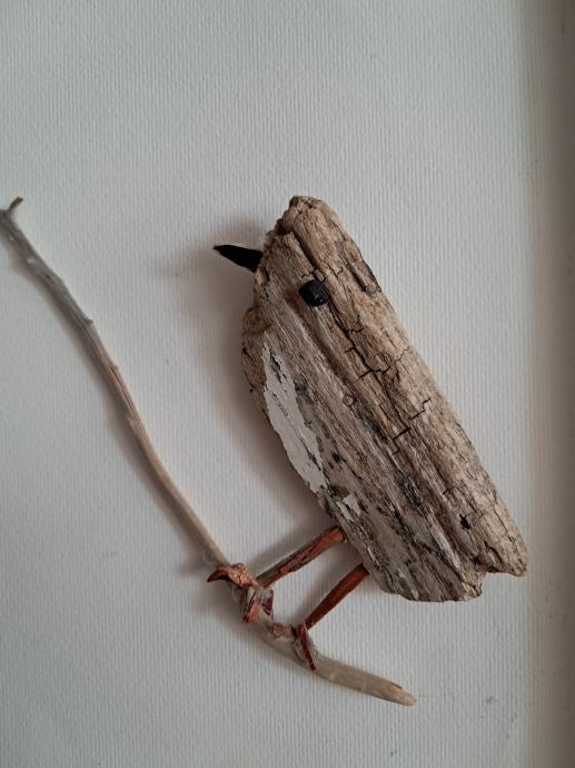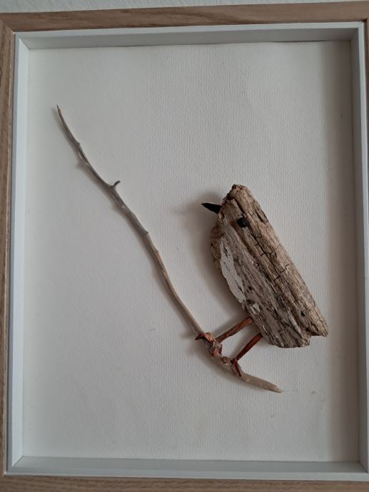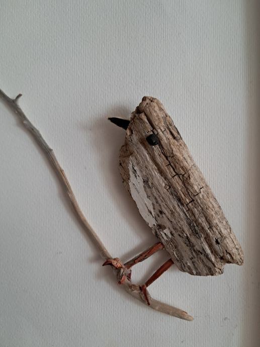 Ova slatka ptičica izrađena je od jednog komada naplavine i grančice.Dimenzija je 22 × 27 cm.