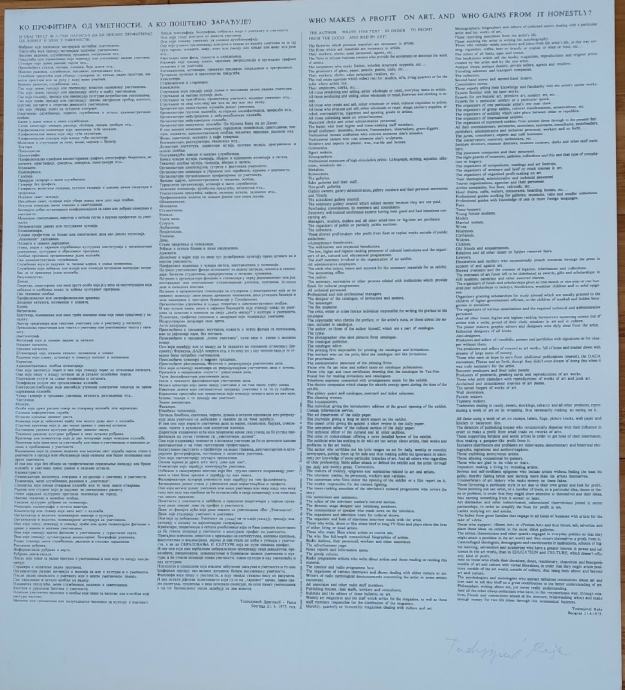 Organizatori umetničkih udruženja i nužno stručno tehničko i administrativno osoblje. I sve ostale niže, više i najviše birokrate koji otimaju novac od umetnika sa osmehom i ponosom na svoje "svete misije" u kulturi i umetnosti. Plakateri, grafički urednici i dizajneri koji potkradaju umetnike. Industrijski dizajneri svih vrsta. Anti-dizajneri. Proizvođači i prodavci: multipla, plakata i porto folija sa potpisima ili za jeftinije pare bez potpisa. Proizvođači i prodavci "ploča umetnika", puni nade i snova o velikom novcu. Oni koji zarađuju ili se nadaju da će zaraditi na ponovom štampanju (reprintu) Fluksusa, DADA pokreta itd., a to nisu ni u snu činili kada je to bilo potrebno umetnicima. Proizvođači suvenira i njihovi prodavci. Proizvođači razglednica, čestitki i reprodukcija umetničkih dela. Oni koji štampaju kalendare sa reprodukcijama umetničkih dela i kičeva. Priznati i nepriznati kopisti umetničkih dela. Tajni falsifikatori umetničkih dela. Javni i priznati falsifikatori umetničkih dela. Modni kreatori koji javno karadu umetnike i na tom poslu zgrću novac. Kreatori dezena koji sistematski srozavaju umetnike i za to su plaćeni.