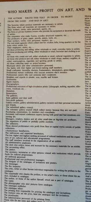 Plaćeni savet galerije. Neplaćeni savet galerije koji ubira novac zato što nije plaćen. Otkupne komisije, njihovi članovi i savetodavci. Beskrajno dobro istrenirani konferencijaši sa zlim ili dobrim namerama u umetnosti. Menadžeri, preprodavci, nakupci i ostali sitni i krupni profiteri od umetnosti. Organizatori javnih ili polujavnih aukcija. Kolekcionari. Lukavi profiteri od boljih ili kapitalnih dela van javnih kolekcija. "Anonimni" darodavci. Poznati i cenjeni darodavci. Niži viši i najviši službenici kulturnih institucija i organizatori umetničkog, kulturnog i obrazovnog programa. Osoblje potrebno za organizovanje jedne uzložbe. Svi administrativni službenici. Službenik koji je zadužen za pisanje adresa i slanje pozivnica za izložbu. Službenik koji nabavlja ili izdaje ili otpisuje potrošni materijal potreban da se aranžira jedna umetnička izložba. Računovodstvo. Domar.