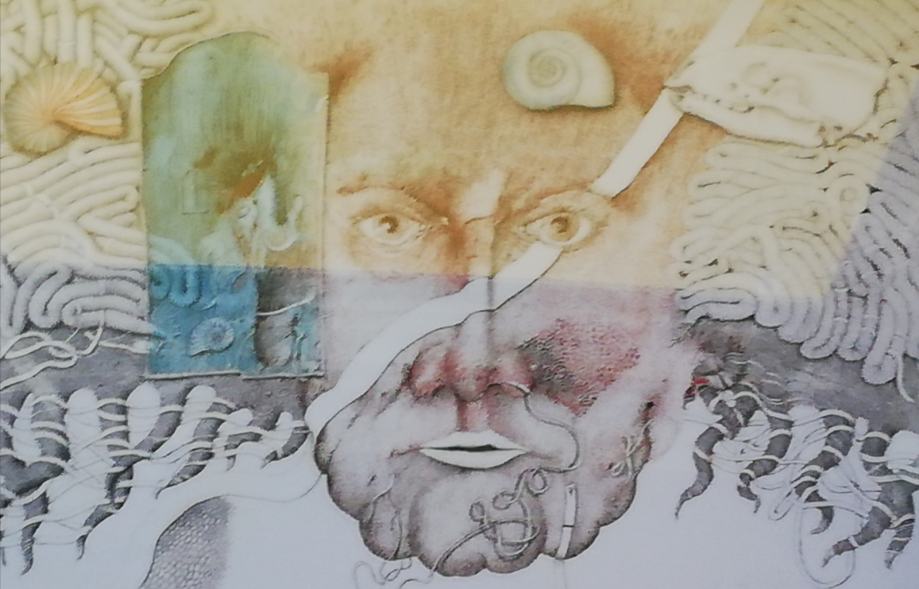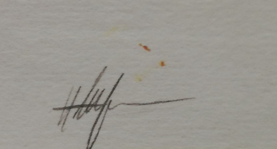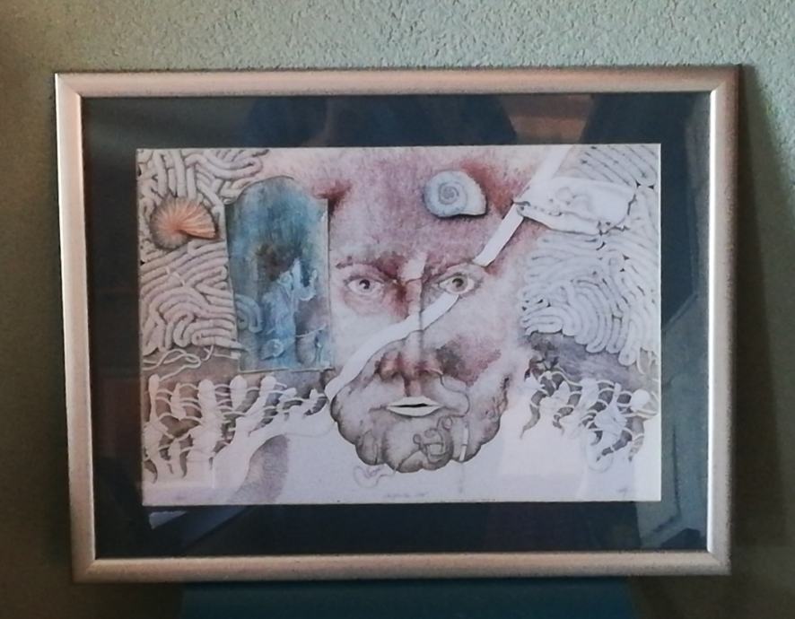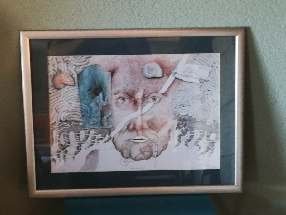 Razmišljanje, potpisana, kombinirana tehnika, dimenzije 56,8 x 43,4 cm, širina okvira 2,4 cm, širina paspatua 3,8 cm.