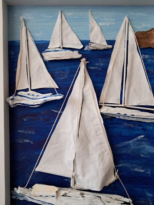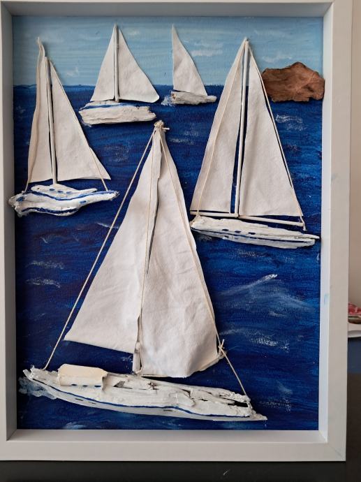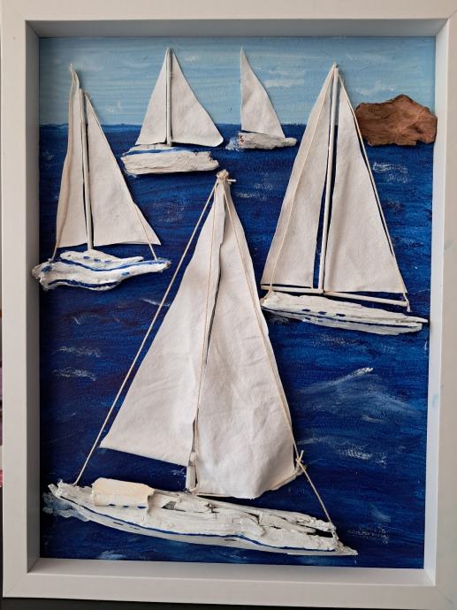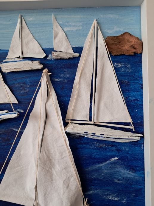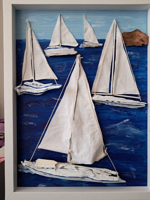 Ova lijepa slika izrađena je od morskih naplavina i obojana akrilnim bojama.Gledajući je, zamišljamo se kako sa obale mora promatramo ovu lijepu regatu.Dimenzije slike su: 42 × 32 cm.
