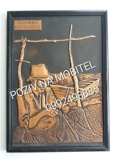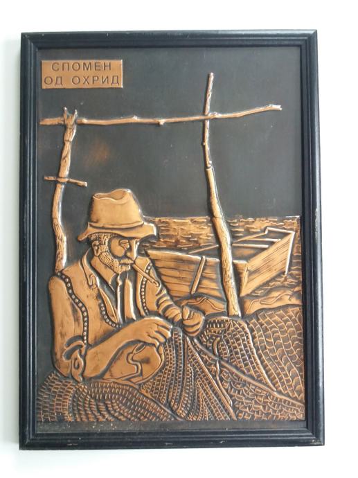 Reljefna slika izrađena u bakru ribar dimenzije 31 cm X 42,5 cm.