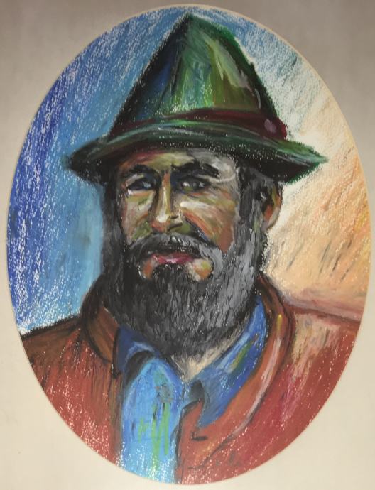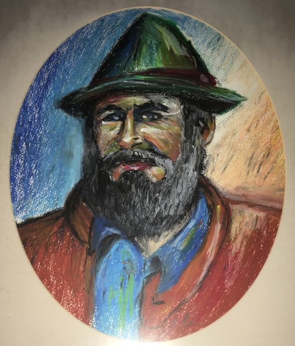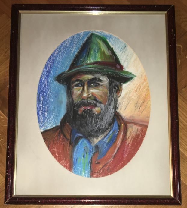 Uljni pastel njemačke slikarice, motiv je muški portret, tehnik uljni pastel. Uramljeno i ostajkljeno. Dimenzije s okvirom su 54x44cm, promjer paspartua je 40 i 30cm.