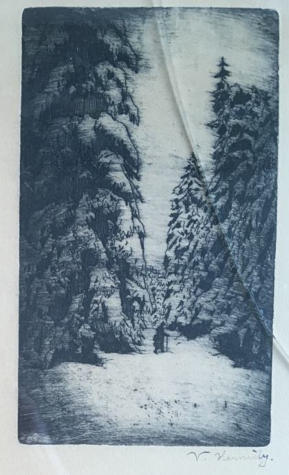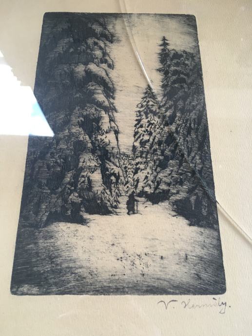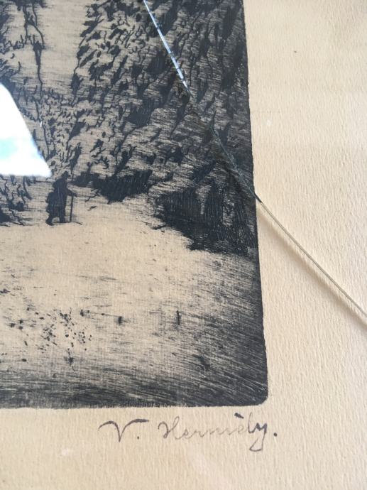 Dva stara bakropisa čuvenog slovačkog slikara i grafičara Viktora Hermelya. Uokvireno i ostakljeno (na jednoj slici je napuklo staklo). Na drugoj slabo vidljivi tragovi vlage na donjem dijelu lista grafike. Dimenzije su cca 40x30cm. Cijena je za obje grafike. Cijene njegovih pojedinačnih grafika na tržištu su 140-180eur.
