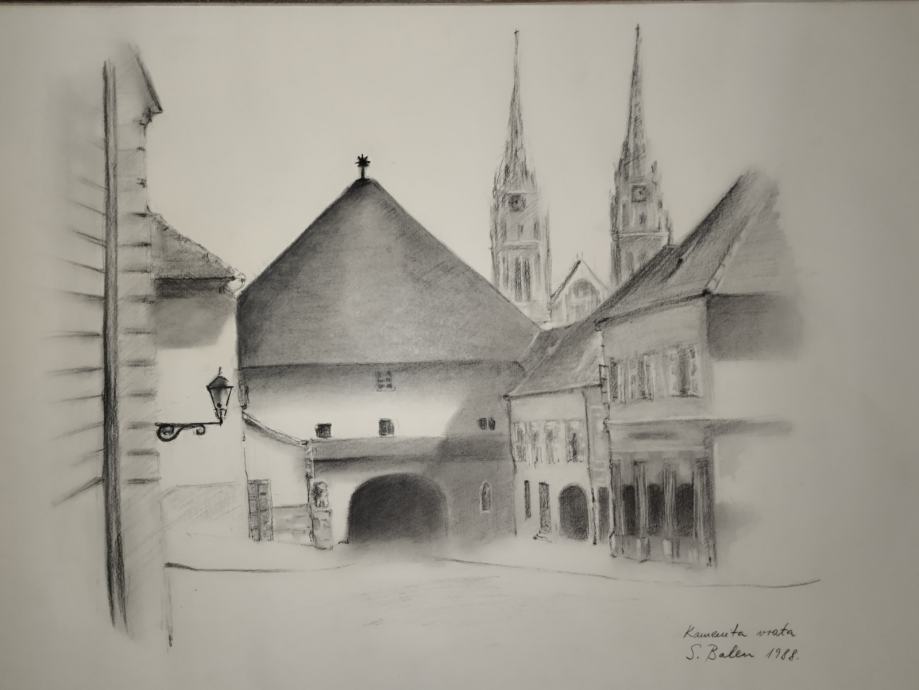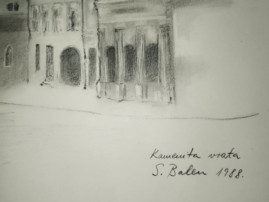 Ugljen na papiru poznate zagrebačke akademske slikarice. Dimenzije 70x50cm. Motiv su Kamenita vrata na Gornjem Gradu u Zagrebu. Nedostaje staklo.