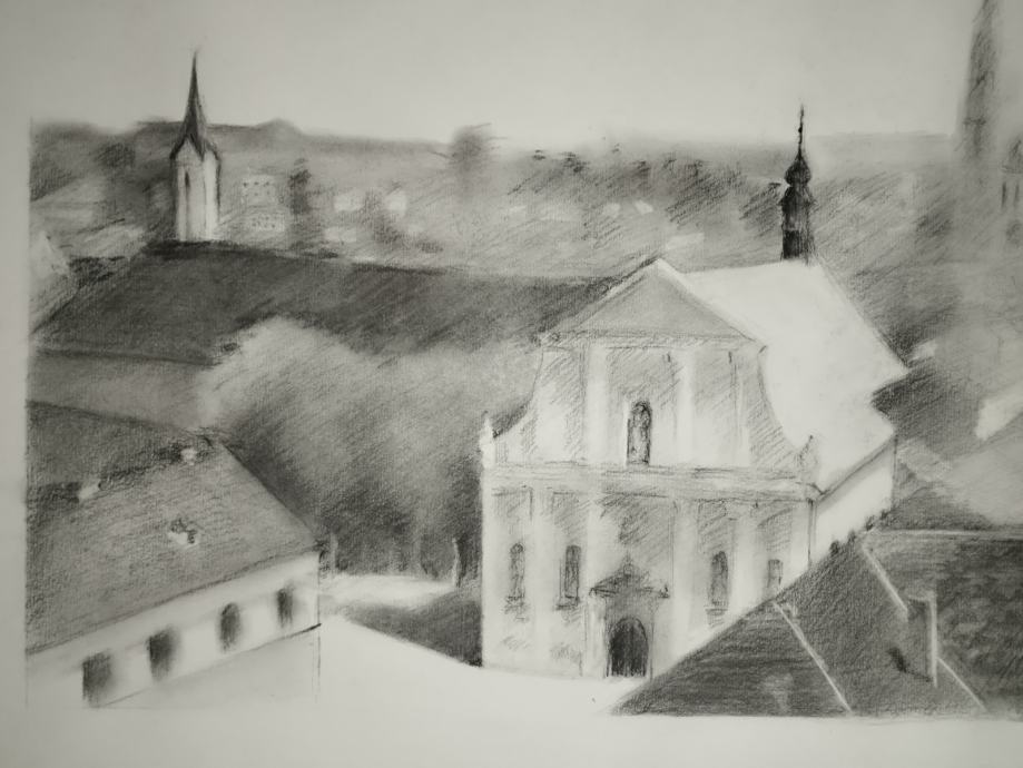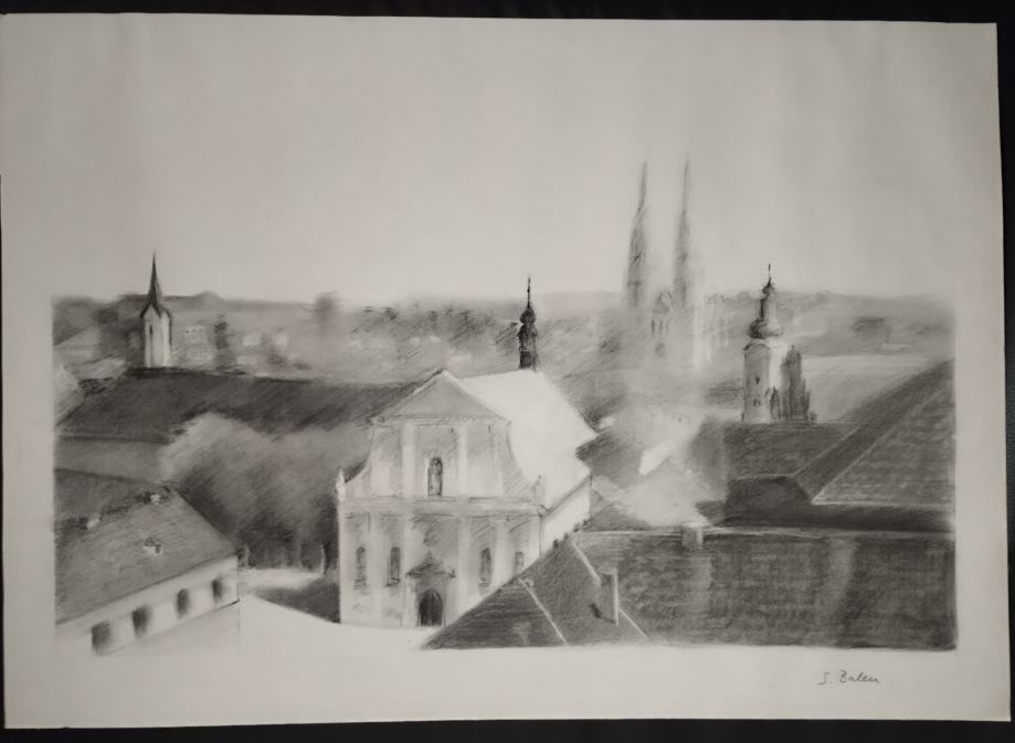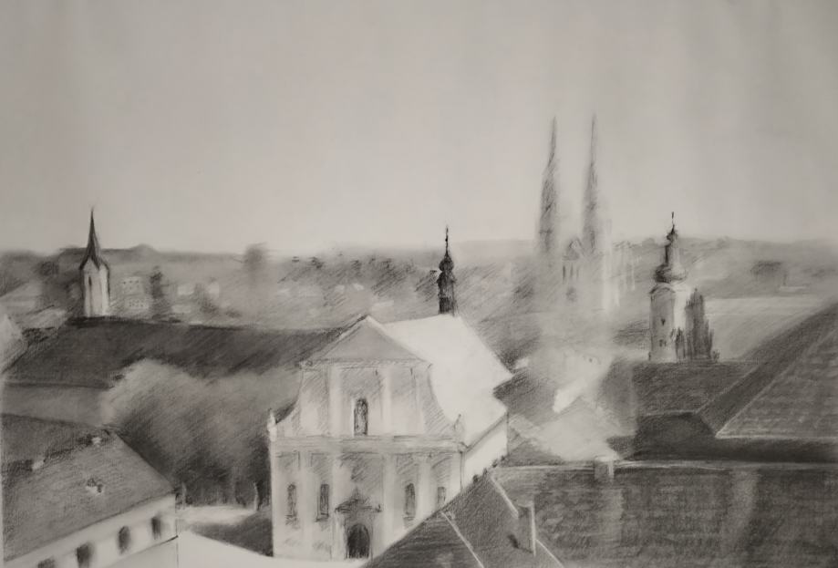 Ugljen na papiru poznate zagrebačke akademske slikarice. Dimenzije 70x50cm. Motiv je crkva sv. Katarine na Gornjem Gradu u Zagrebu.