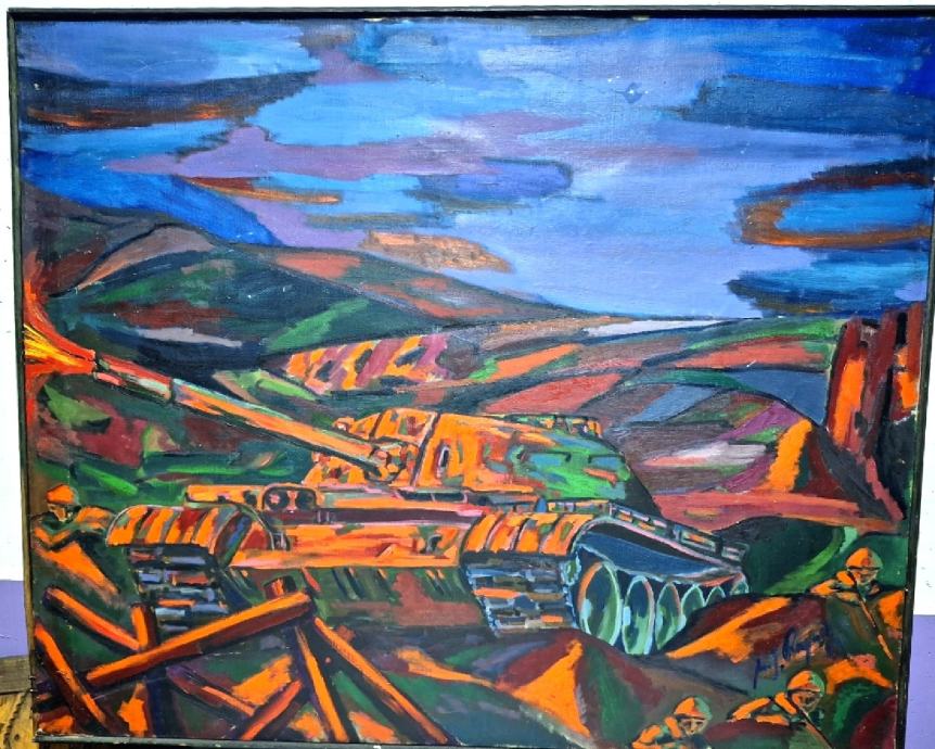 "ŠARENI TENK",ODLIČNO VELIKO ULJE NA PLATNU,POTPIS AIDA ??111/92 CM