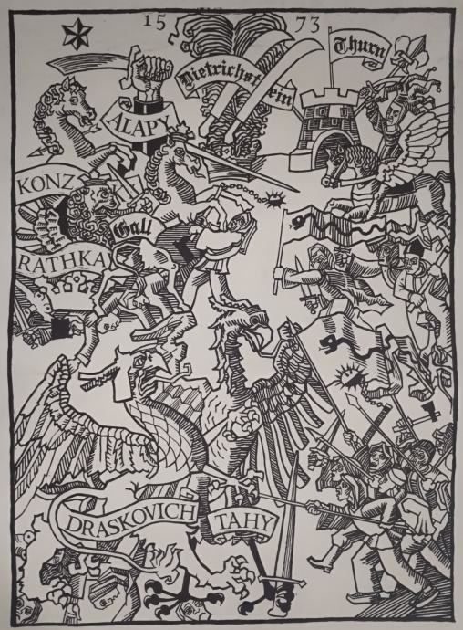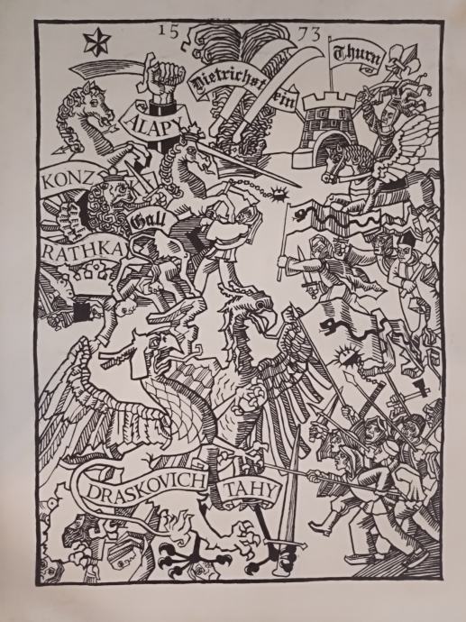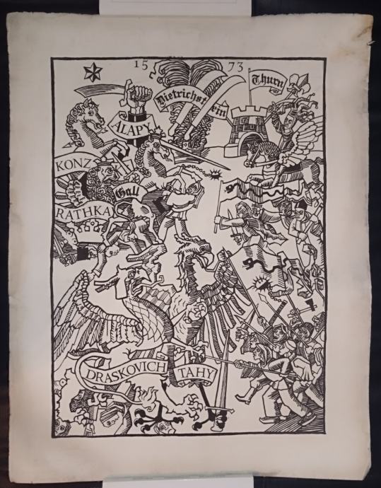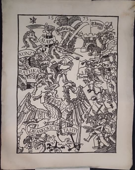 Nepotpisana grafika s motivom Seljačke bune. Nepoznati autor. Dosta sitnih oštećenja na rubovima papira (lako za prekriti paspartuom). Sama slika u vrlo dobrom stanju.