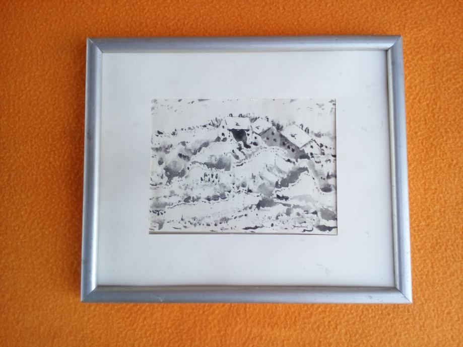 -24 x 20 cm ukupno, slika se odvojila od paspartua pa se miče. Staklo nedostaje