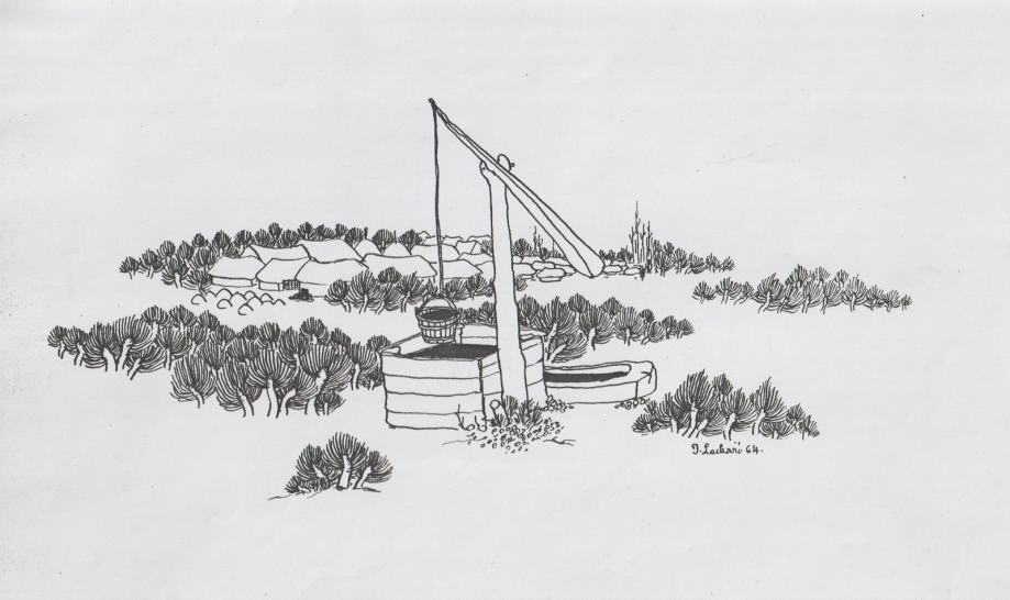 Fini linearni crtež Ivana Lackovića Croate iz 1964. godine prikazuje stilizirani podravski krajolik s tradicionalnim bunarom (đeramom) u prvom planu. Rad odlikuje karakteristična precizna linija i ritmično ponavljanje vegetacijskih motiva, što je tipično za umjetnikovu ranu fazu. Minimalistička kompozicija i naglašena grafičnost daju djelu dekorativnu i dokumentarnu vrijednost unutar naivne umjetnosti.