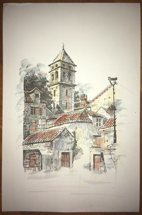 Akvarelom dorađene grafike slikara Sergia Tišine s dalmatinskim / morskim motivima. Dimenzije listova su cca 50x35cm. Pojedinačna cijena je 150kn.
