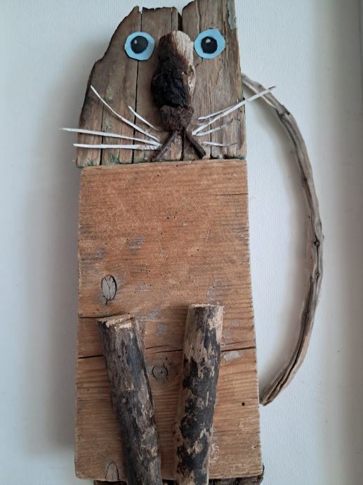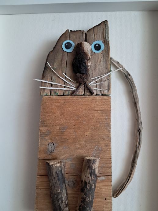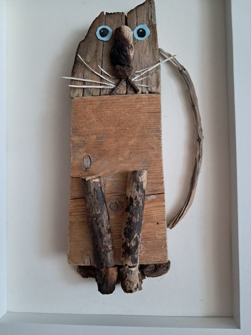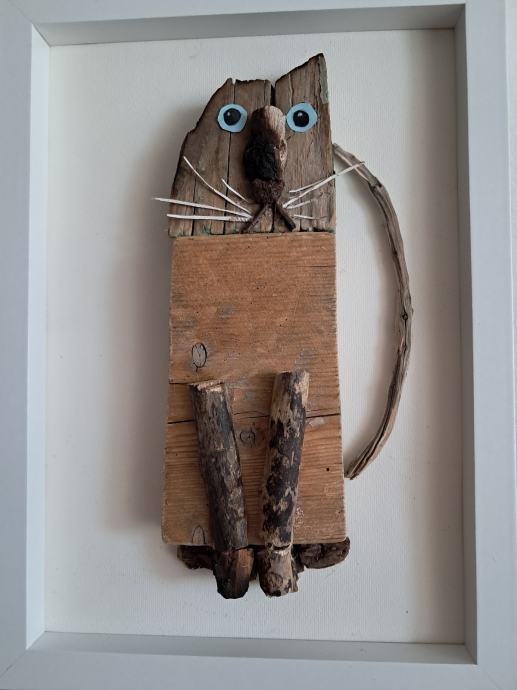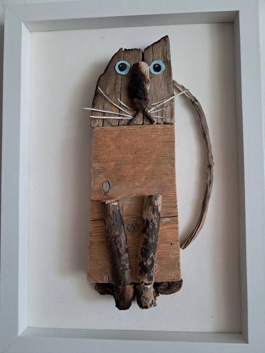 Ova sijamska mačka izrađena je od komada naplavina sa obale mora.Kombinacijama drvaca i detalja nastala je ova zanimljiva maca.Dimenzija je 23 × 32 cm.