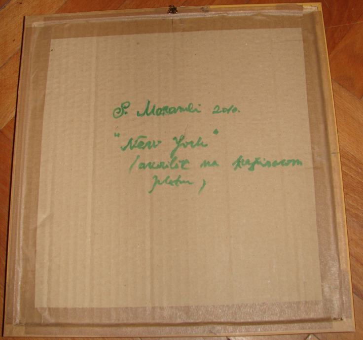 Silvia Morandi – New York, akrilik na kaširanom platnu, dimenzije 32x31cm. Akademska slikarica rođena u Rimu 1975. godine gdje je i završila slikarstvo na Likovnoj akademiji. Povremeno boravi u Splitu gdje ima ljetni atelje. Spada među najznačajnije mlađe predstavnike apstraktnog lirskog impresionizma. Do sada je izlagala na više izložbi u Italiji, te na izložbi u Parizu, Nici, Lisabonu, Ateni i Stockholmu