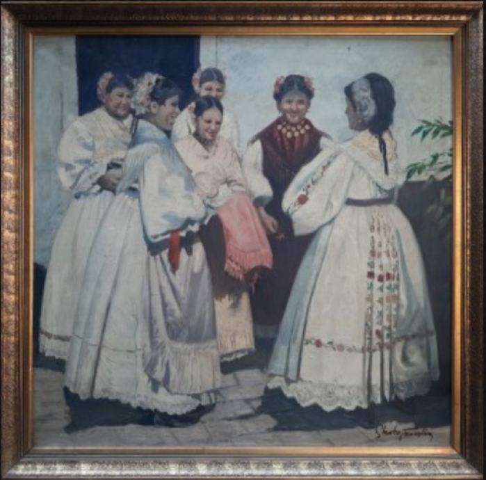 Slavko Tomerlin "Djevojke pred crkvom" ulje na platnu 90x90cm;