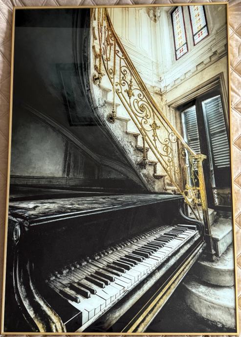 Elegantna slika u zlatnom okviru s motivom starinskog klavira i raskošnog stepeništa. Daje prostoru luksuzan i sofisticiran izgled.