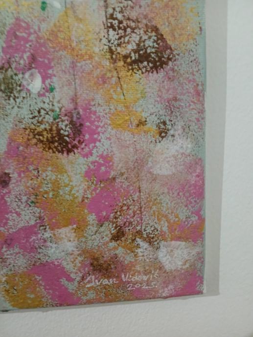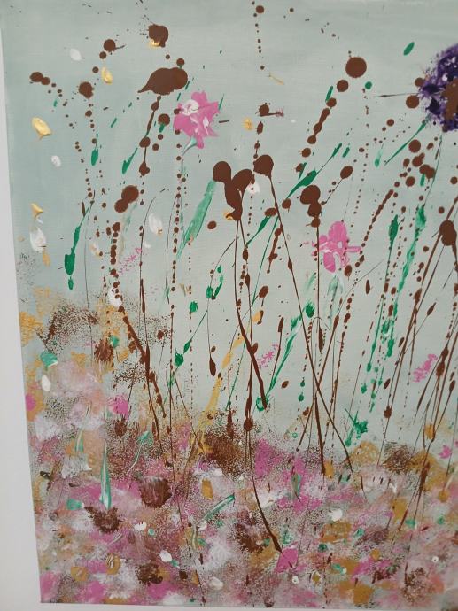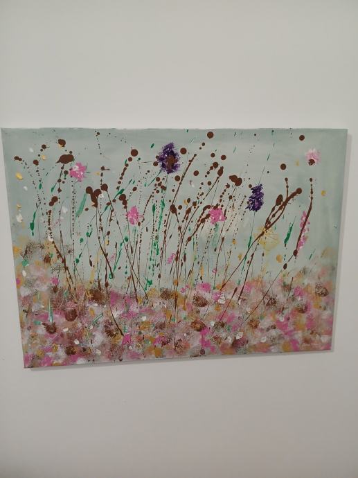 Slika prikazuje cijeće u prirodi, akril na platnu, moderna tehnika, za oplemeniti svaki moderni dnevni boravak, kao pozdrav gostim na hodniku ili kao mali smiraj u spavaćoj sobi za kraj ili novi početak dana.