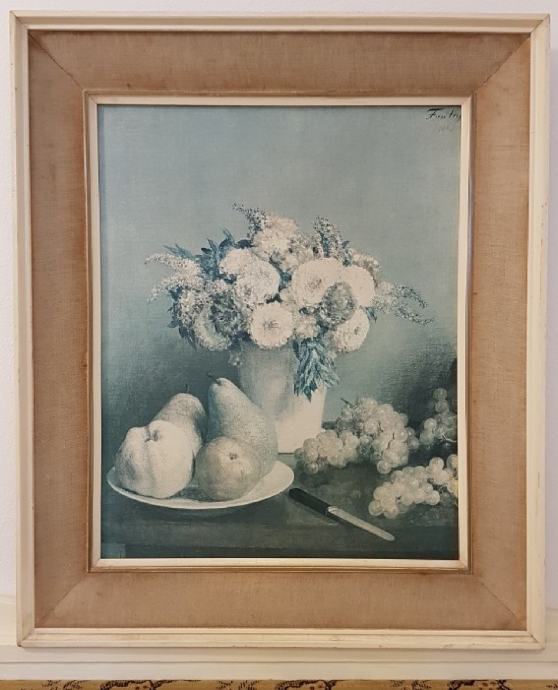 Prodajem sliku cvijeće u vazi okruženo voćem.