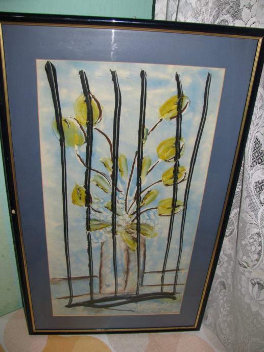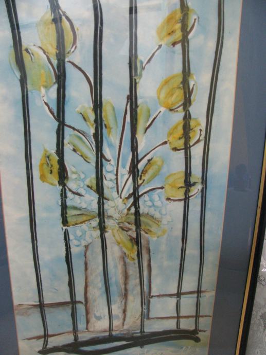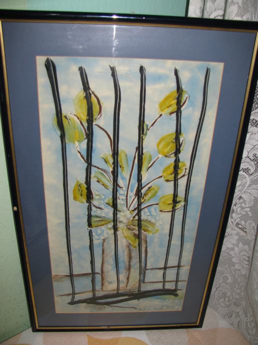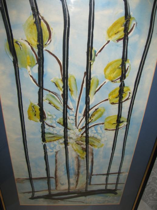 Sama tehnika meni nepoznata, deblji nanosi kistom crne i žute boje cvijetova, dosta reljefno.