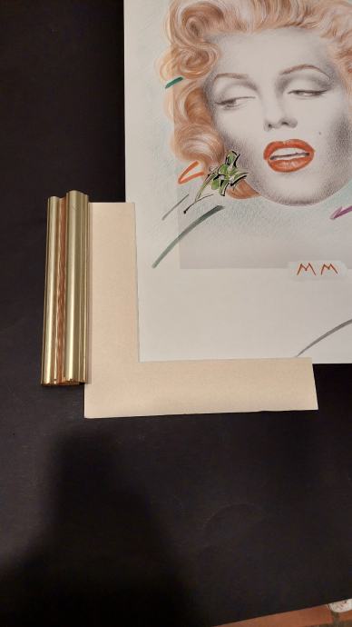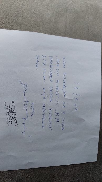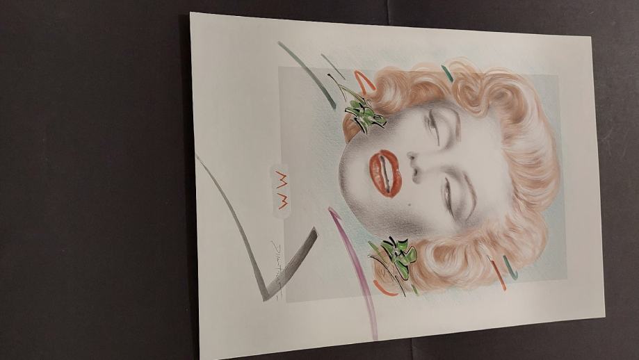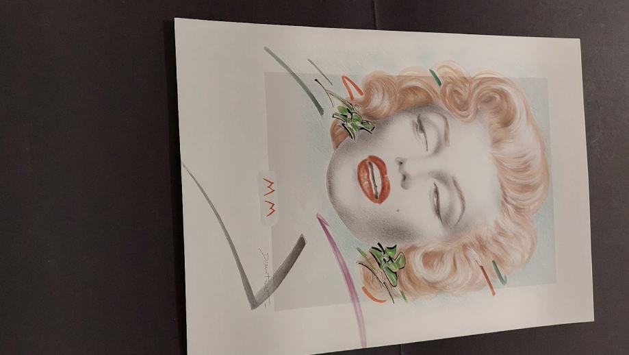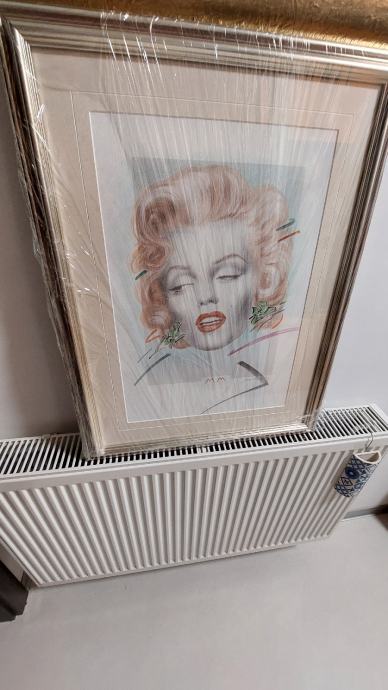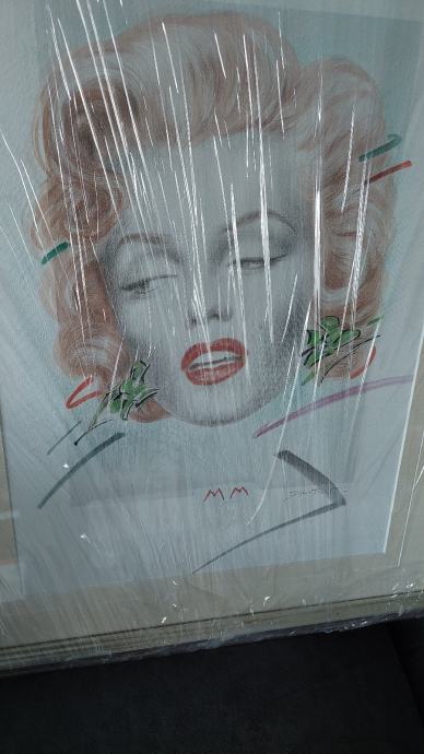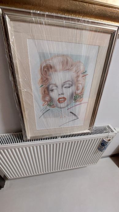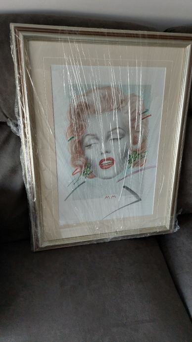 Slika Dimitrija Popovića iz ciklusa Marilyn Monroe slikana je kombiniranom tehnikom u dimenziji 50×35cm. Potpuno novo opremljena s orginalnim certifikatom od samog autora. Kupac na taj način dobiva 100% sigurnost kako dobiva orginalno dijelo. Najčešći fejkovi su upravo kod M.M. Sliku mogu nabaviti i u jednoj od drugačijih verzija te je možete kupiti i neuramljenu te sami odlučiti kako želite da slika izgleda. U tom slučaju cijena je 300€. Kod ove slike radio sam opremu u dogovoru s kupcem i on je sam odlučivao kakav želi paspartu i okvir.