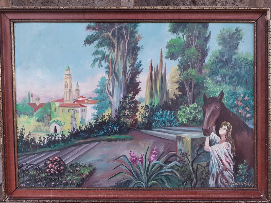 Prodaje se umjetnička slika sa motivom engleskog perivoja sa potpisom R. Banjeglav. Slika je slikana tehnikom ulje na lesonitu. Dimenzije slike su 80x55 cm. Okvir slike je oštećen na više mjesta (vidljivo na fotografijama). Cijena slike je 253 eura. Mogućnost osobnog preuzimanja u Zadru. Kontakt broj mobitela 091 131 10 36.