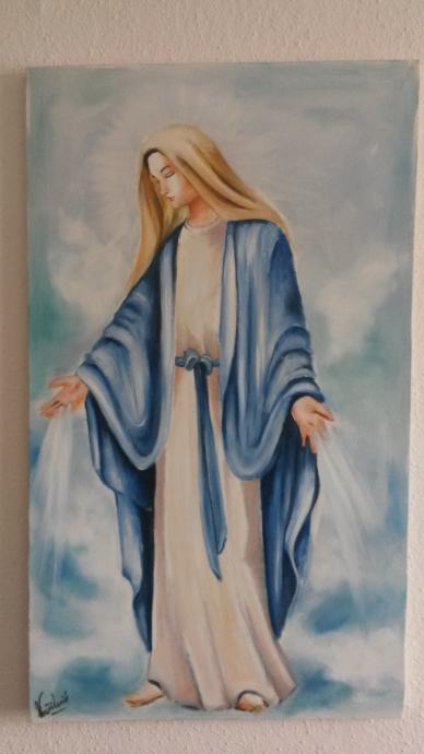 Motiv slike je Gospa, naslikana prije 2dana te se još suše boje. Na sliku još nije stavljen okvir pa je zato cijena pristupačnija. Okvir se može bez problema stavit u jako kratkom roku.