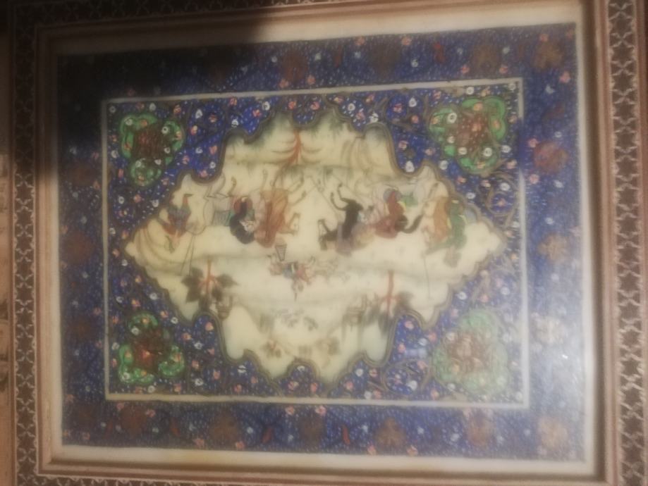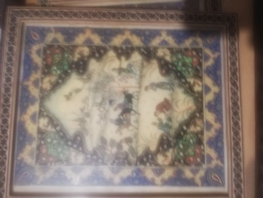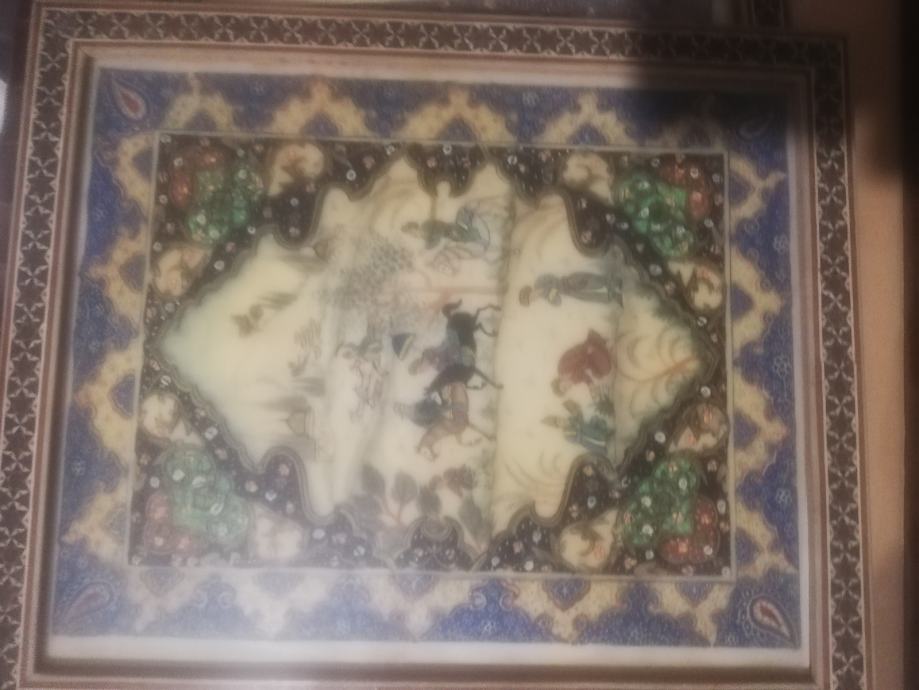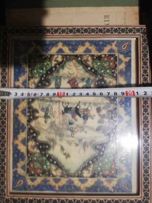 Slika prikazuje umjetničko djelo u tehnici Khatam Kari, drevnoj perzijskoj umjetnosti intarzije.