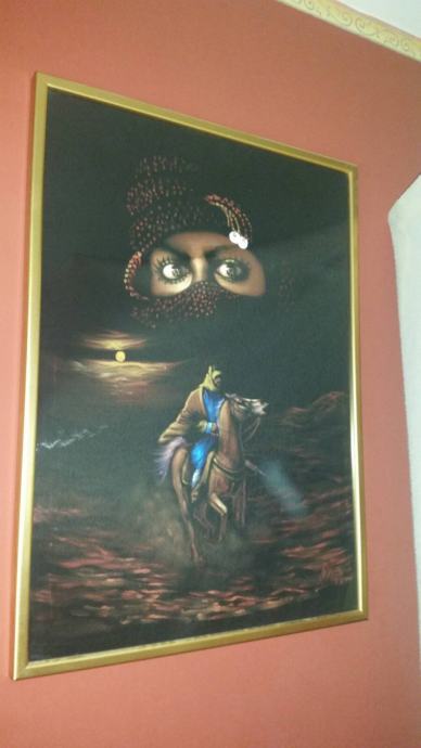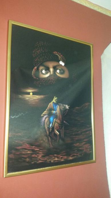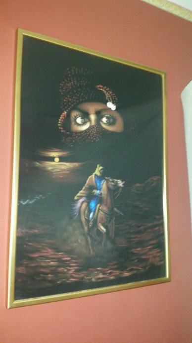 prodajem jako lijepu sliku,koja pod odredenim kutem svjetla blješti u mraku,kao da se vidi uzivo,jahac u pustinji,slika je od svile(kadife),ova crta iznad sta se vidi to supruga drzi deku da ju mogu ljepse poslikat,jel ima odsjaj od stakla,najbolje pogledat uzivo bez obaveza!!!!!dimenzija slike 87cmx63.5cm kupljena u Iraku!!!!