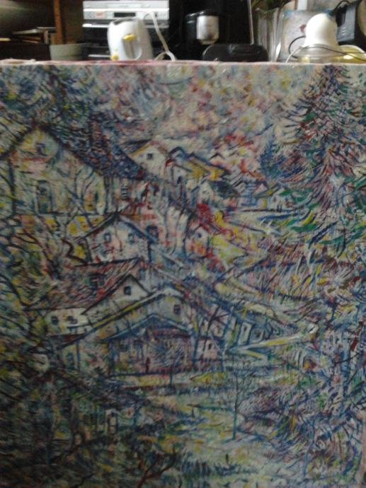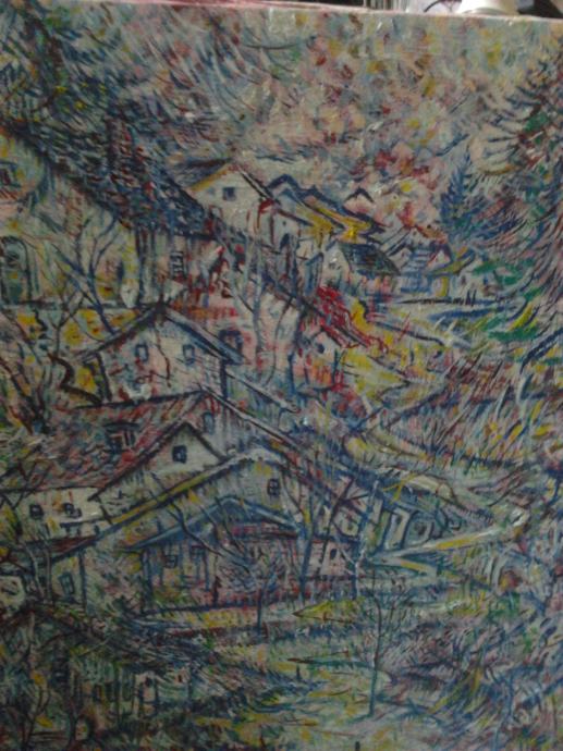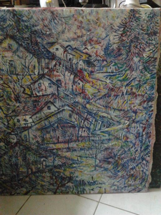 slika je veličine 88cm visine, a 76 cm široka. ulje na platnu, u prozirno plavim pastelnim bojama, malo na veseo i nadrealan način predodžba čisto planinskog i seoskog, reklo bi se i sirotinjskog motiva kuća na brdu, s naznakom na prirodu.Slika plijeni veličinom. Da se lijepo uokviriti plavom ili srebrnom malo debljom lajsnom. Cijena je 100 Kn, jer se radi o još nepoznatom umjetniku, koji se želi afirmirat.