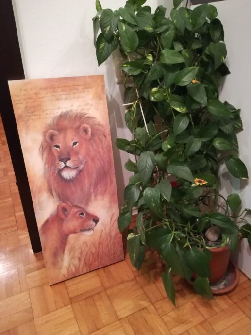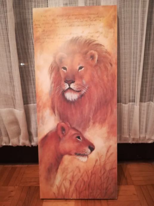 Predivna slika LIONS WATCH prenešena na canvas platno koja bilježi sve živopisne boje i detalje; okvir slike je drveni.