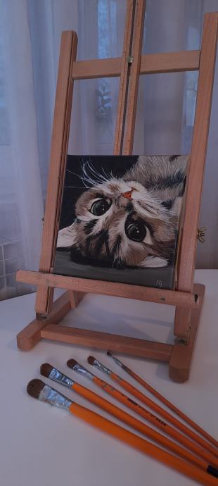 Prodajem originalnu ručno oslikanu sliku preslatke mačke na platnu, dimenzija 20x20 cm. Slika je izrađena uljanim bojama.